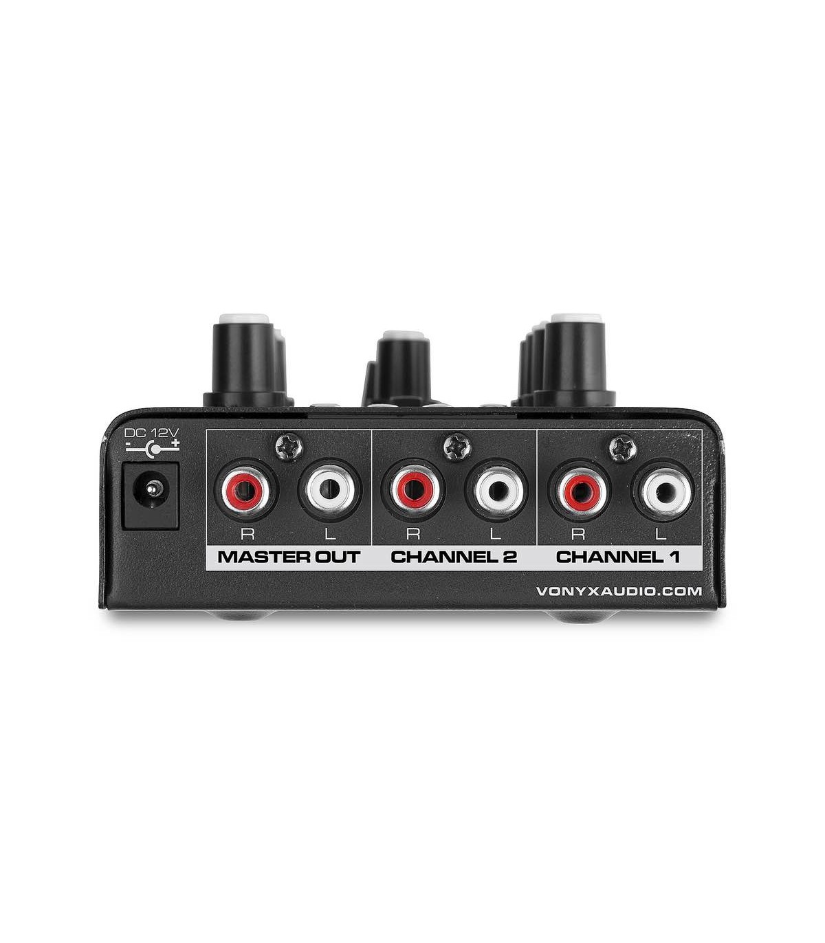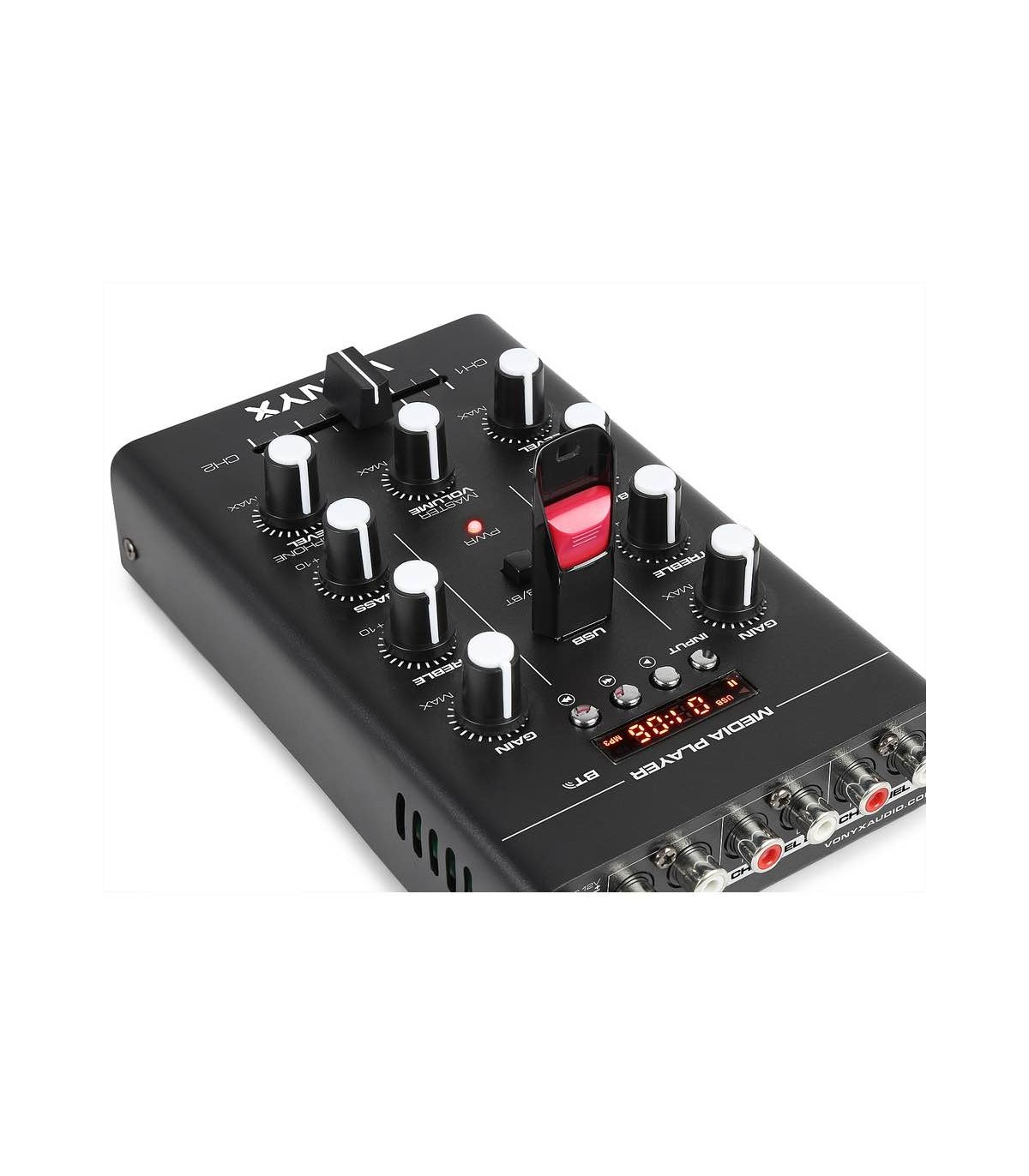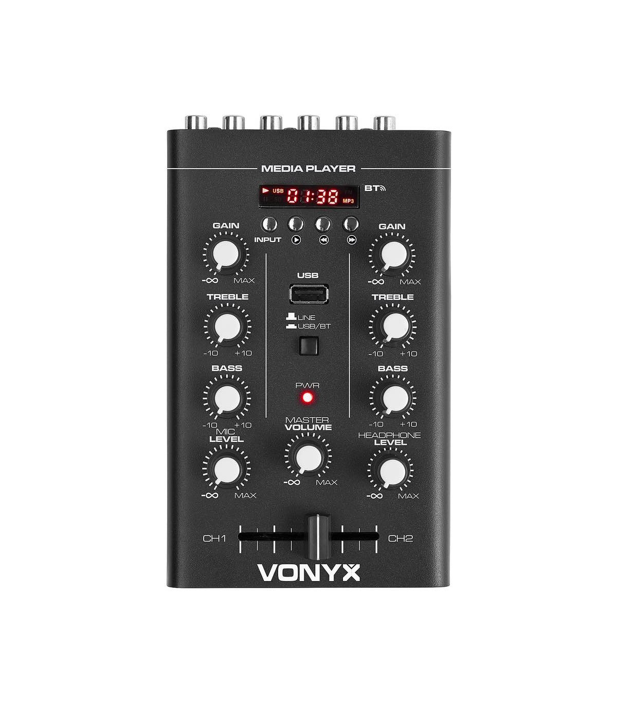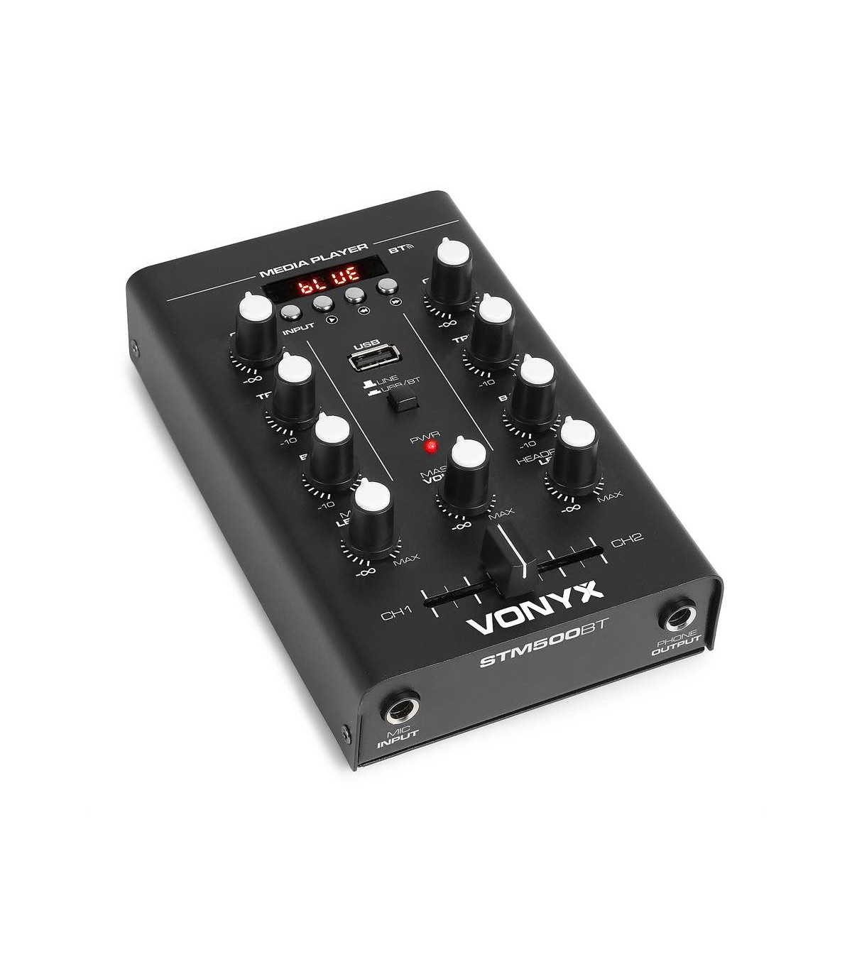 Il Vonyx STM500BT è un mixer DJ super portatile e leggero con BT. Oltre ai due ingressi RCA di linea e un'uscita RCA principale, c'è un ingresso per microfono e un'uscita per cuffie nella parte anteriore. Ogni canale ha un equalizzatore a 2 bande e la qualità del suono e la gamma dinamica rendono il mixer uno dei migliori della sua categoria. Dotato di un lettore multimediale con display per riprodurre MP3 direttamente da una chiavetta USB.