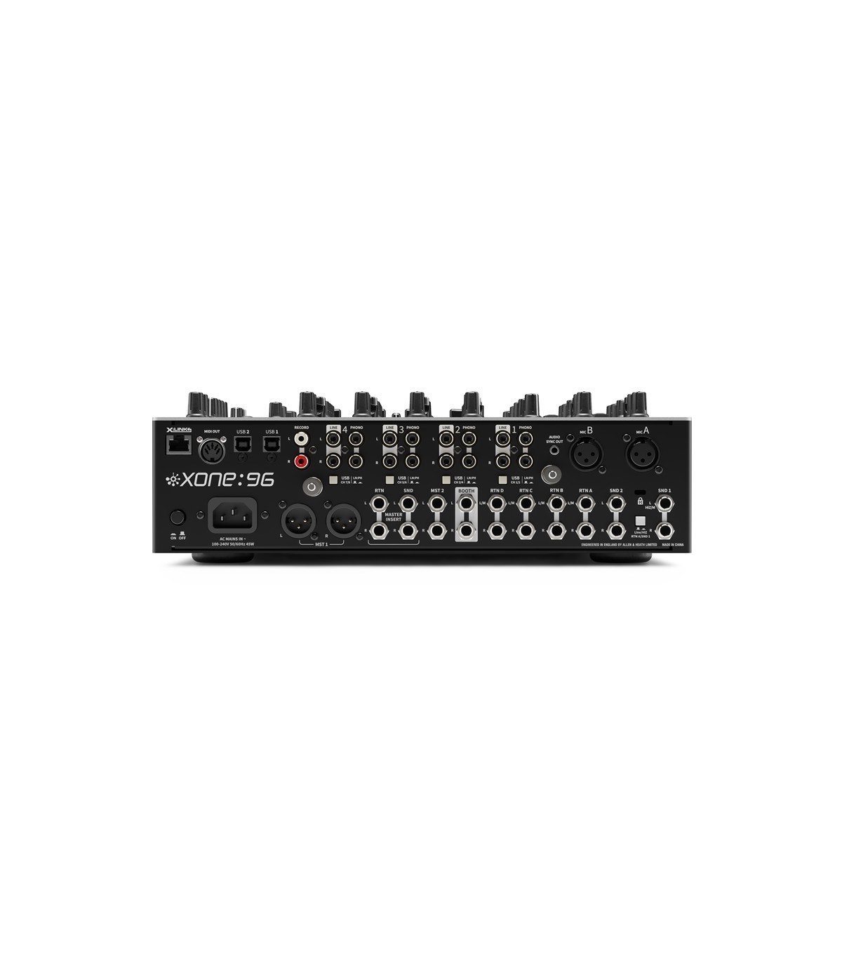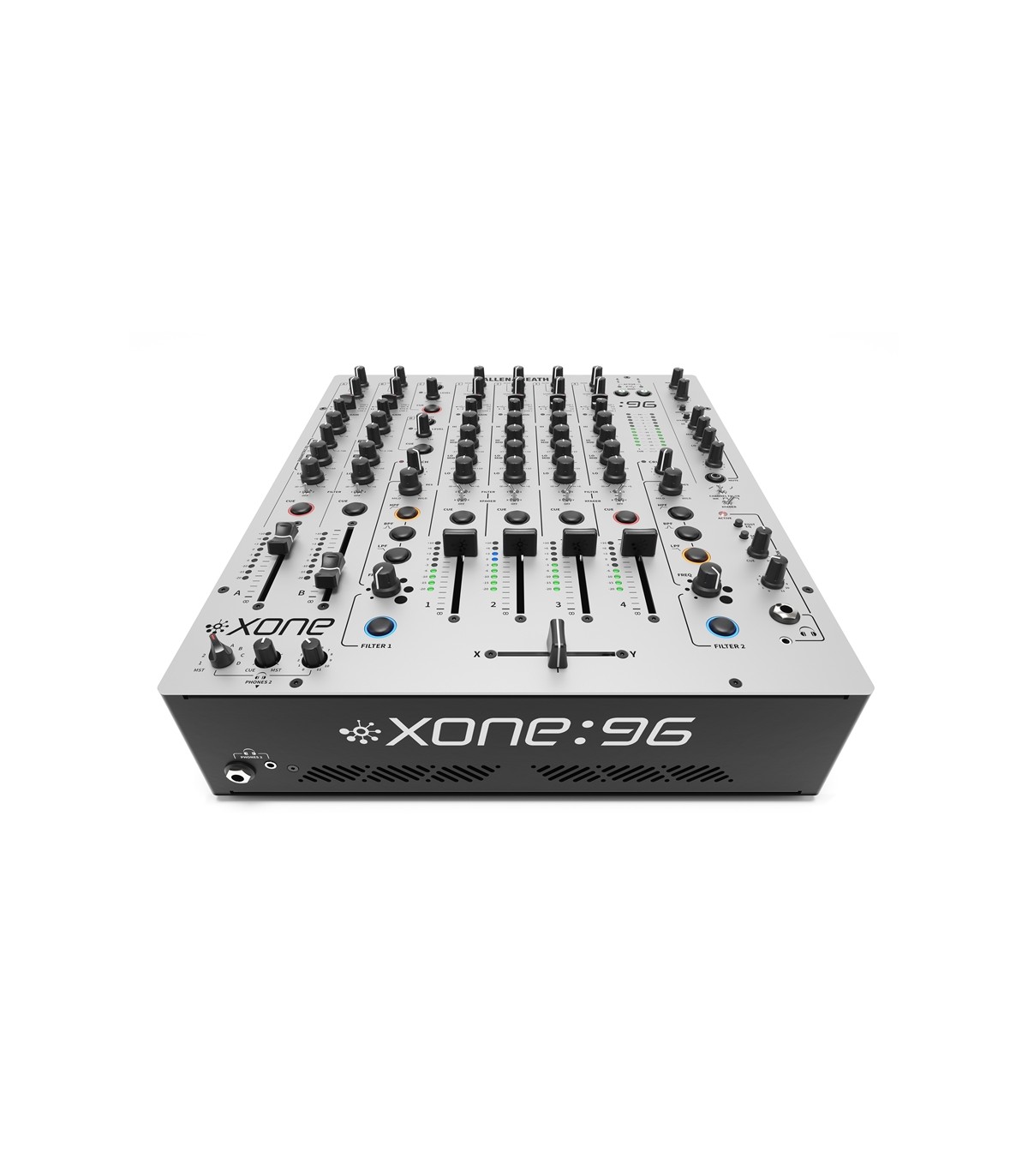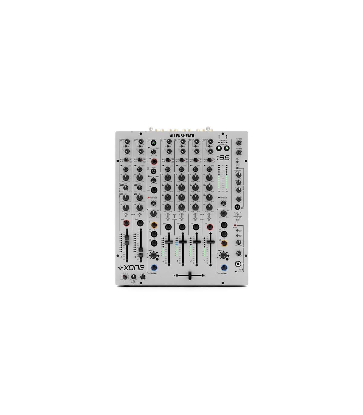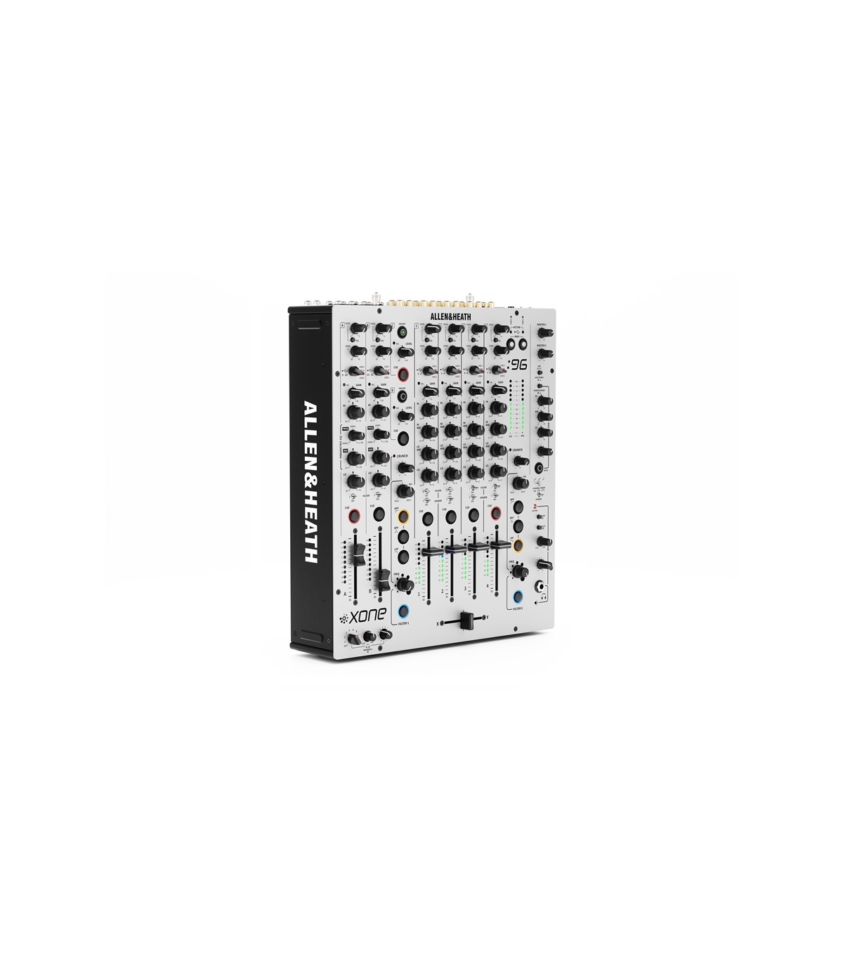 Rispetto al 92 nel 96 troviamo: ingressi phono con RIAA ottimizzata +6dB, due canali Return aggiuntivi, distorsione armonica pre-filter applicabile mediante il potenziometro Crunch, equalizzatore semi-parametrico (con medi sweep) sui due canali A e B, due sezioni di preascolto completamente indipendenti, un equalizzatore a 3 bande sull’uscita Booth. Allen & Heath XONE:96 è il mixer di punta del catalogo analogico della serie XONE. Costruito interamente in metallo, il 96 monta fader di nuova concezione progettati appositamente dalla stessa azienda Inglese per una miglior resa e durevolezza e un crossfader Innofader mini che ne migliorano le prestazioni.