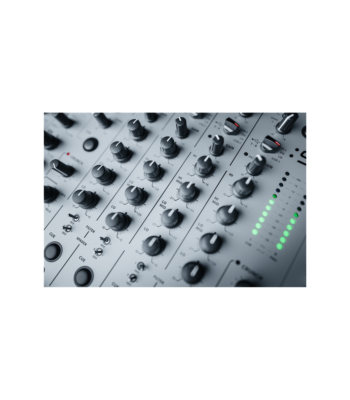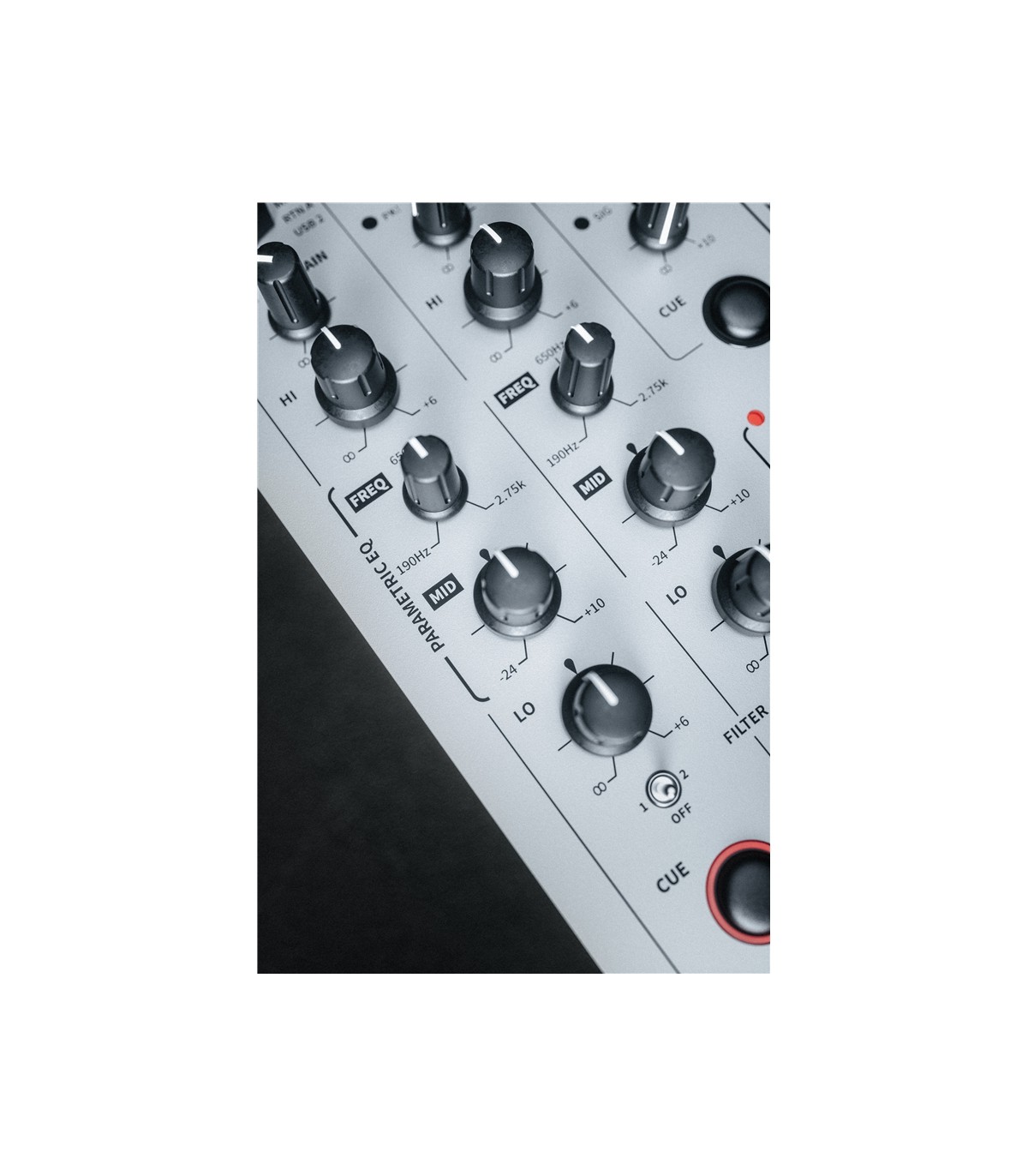 I canali A e B sono equipaggiati di un gain, indicatore di picco/distorsione e di un equalizzatore asimmetrico con capacità di attenuazione maggiore (Kill) rispetto all’enfatizzazione (+6dB) per le basse e alte, mentre sulle medie troviamo un nuovo eq semi-parametrico con frequenza impostabile dai 190 ai 2750Hz e il relativo controllo di guadagno regolabile da -24dB a +10dB. Gli ingressi selezionabili da un commutatore a scatto sui canali A e B sono: MIC, Return (line Jack), USB 1 e USB 2.