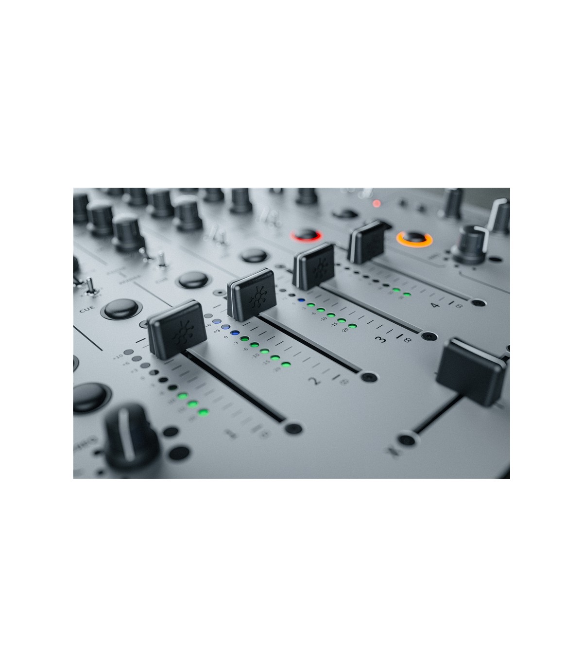 Tutti e 6 i canali (A, B, 1, 2, 3 e 4) dispongono di un fader dall’escursione di 60mm, un meter a 9 LED che ci mostra il livello (da -20dBu a +10dBu) del segnale in ingresso processato dall’eq prima che sia soggetto all’intervento del fader, di un pulsante “CUE” per l’invio verso il preascolto in cuffia (sezione Monitor), di due potenziometri (Send 1 e Send 2) per inviare il segnale verso le omonime uscite e dell’interruttore “Filter 1/Filter 2” per l’invio del segnale di ogni singolo canale verso uno dei due filtri multimodo integrati nel mixer. I canali “numerati” dispongono inoltre dell’interruttore “X/Y” per l’assegnazione ad uno dei lati del crossfader: X lato sinistro, Y lato destro.