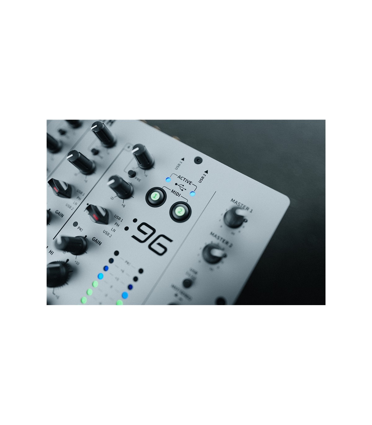 Nel mixer sono disponibili due uscite Master analogiche indipendenti, cioè con controlli separati dei volumi: la Master 1 su connettori XLR (maschio) e quella Master 2 su prese femmina jack da ¼” di tipo TRS. Entrambe le coppie di uscite sono bilanciate. In prossimità della sezione Master è presente un meter stereo a due barre da 11 LED che ci consente di monitorare visivamente (dai 35dBu ai +10dBu) il segnale in uscita prima che sia soggetto al controllo di volume Master. Quando uno dei pulsanti CUE è attivo, sui meter viene indicato il livello del segnale assegnato al preascolto. Se si attiva invece lo split Cue, sul meter di sinistra vedremo il segnale del canale in preascolto e su quello di destra quello in uscita verso il master.