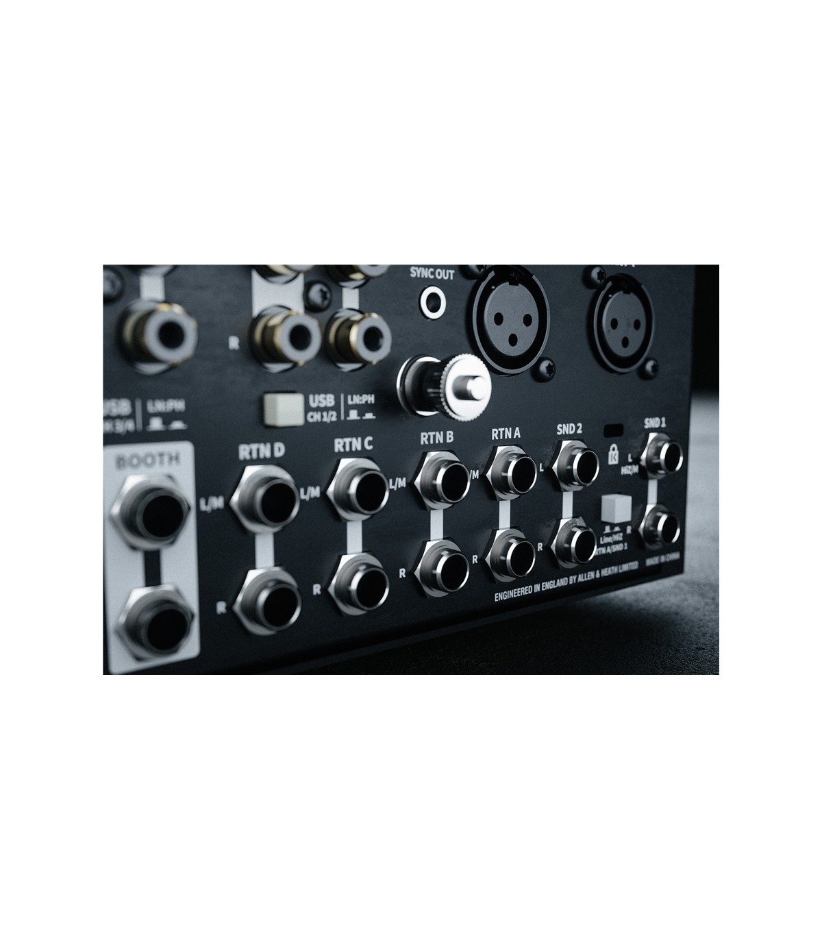 Tutte le uscite Send sono bilanciate (TRS) su prese Jack da ¼”, utilizzabili in configurazione stereo (L e R) oppure mono (L). Per inviare il segnale dei canali a queste uscite basta utilizzare gli omonimi potenziometri presenti in testa ai channel strip. Il Send 2 opera nel modo “post” fader, mentre il Send 1 è configurabile dall’utente su ciascun canale in modo “pre”, o “post” fader mediante l’apposito pulsante. Vi è un’altra uscita stereo chiamata “Audio sync out” su connettore mini jack da 1/8” (3.5mm) utilizzabile come un ulteriore record out, nonché per il collegamento a eventuali futuri accessori che verranno prodotti dalla stessa azienda Inglese.