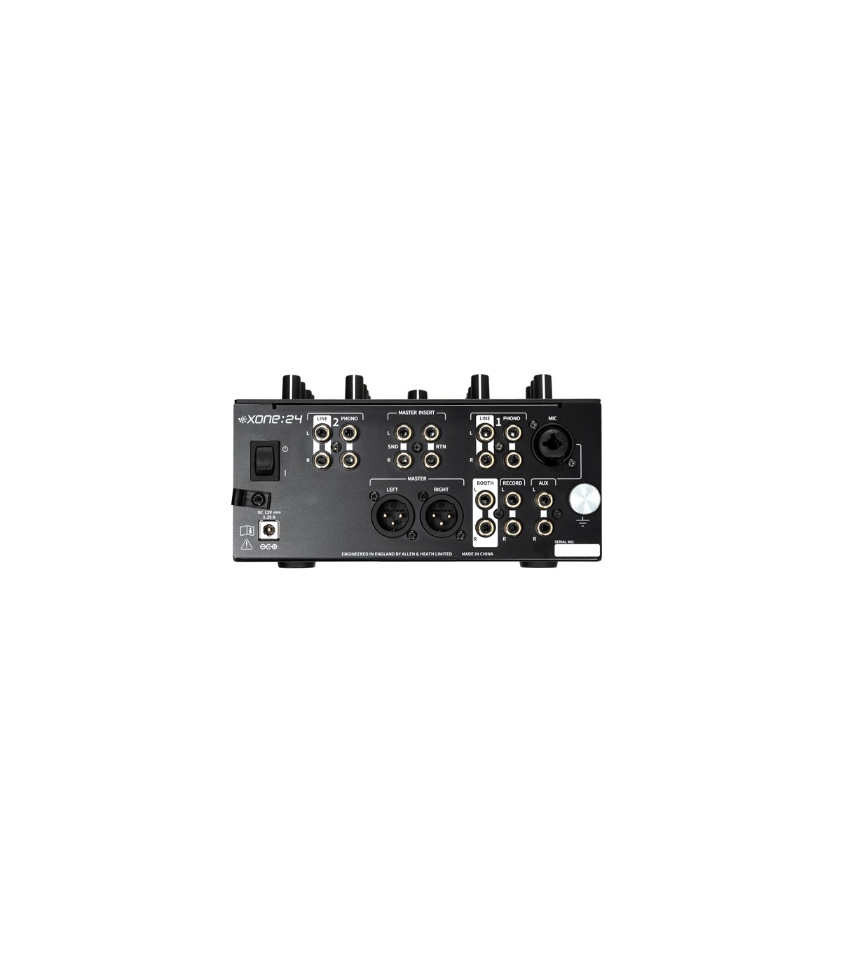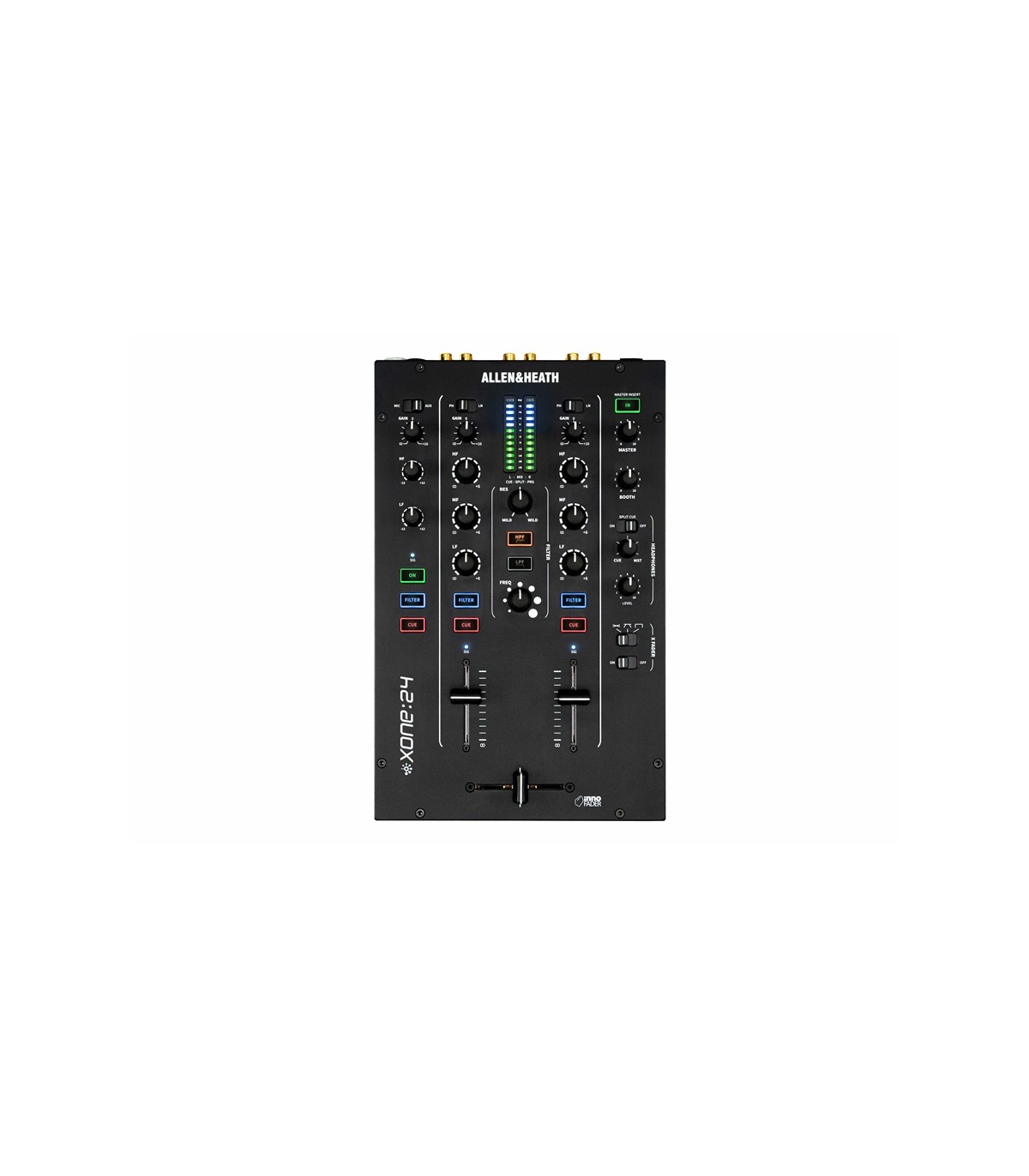 Mixer per DJ analogico a 2 canali phono/line con EQ a 3 bande, filtro Xone:VCF e crossfader Mini innoFADER. Connessioni master Insert FX In/Out. Canale 1 combo mic/line. Uscite Master XLR, booth e record RCA.