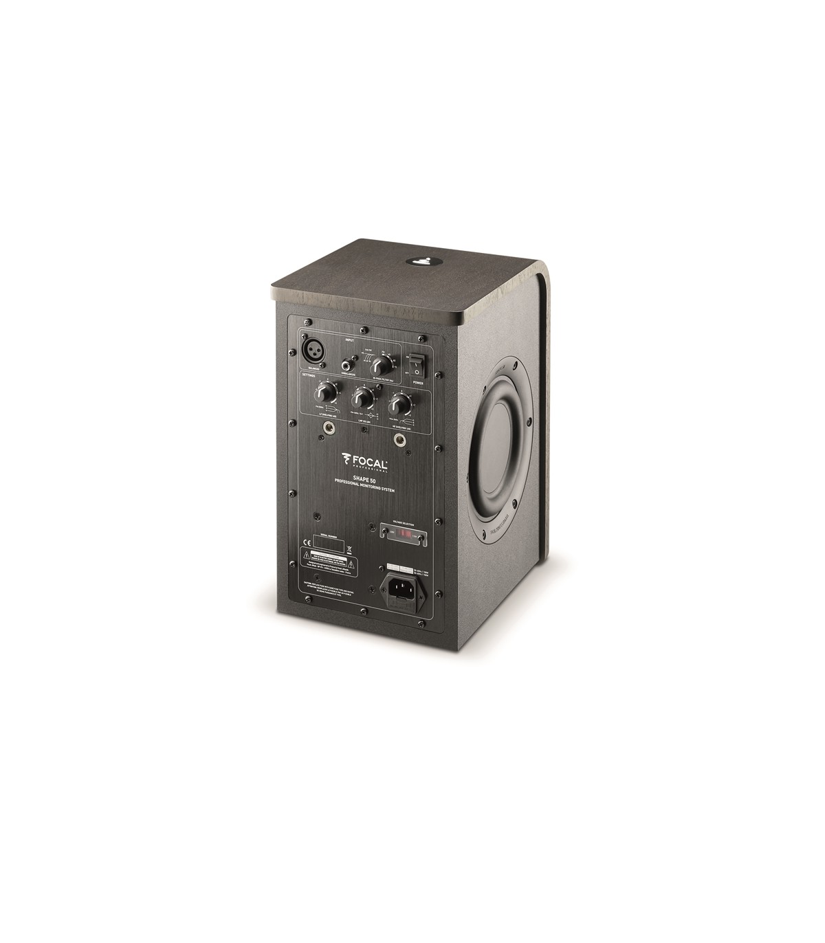 Focal Shape 50, monitor nearfield attivo; 60 + 25 watt classe ab; woofer da 5" flax cone; tweeter da 1" alluminio-magnesio 'M' shaped; due radiatori passivi laterali da 5"; risposta in frequenza (+/-3 db): 50 Hz - 35 kHz; max spl peak@1m (musical signal): 106 db; impedenza ingressi: 10 kΩ controlli: filtro passa-alti, bassi, medi, alti; power switch; funzione automatica di standby; costruzione: mdf 12 mm; finiture: vinile, legno di noce e vernice nera; connettori: xlr bilanciato ed rca sbilanciato con sensitivity compensation; staffa per montaggio a parete ed a soffitto (viti ed accessori non forniti); dimensioni: 191 x 242 x 312 mm; peso: 6,5 kg.