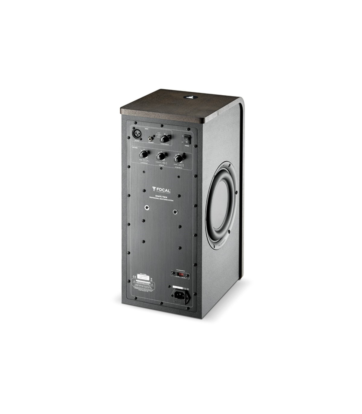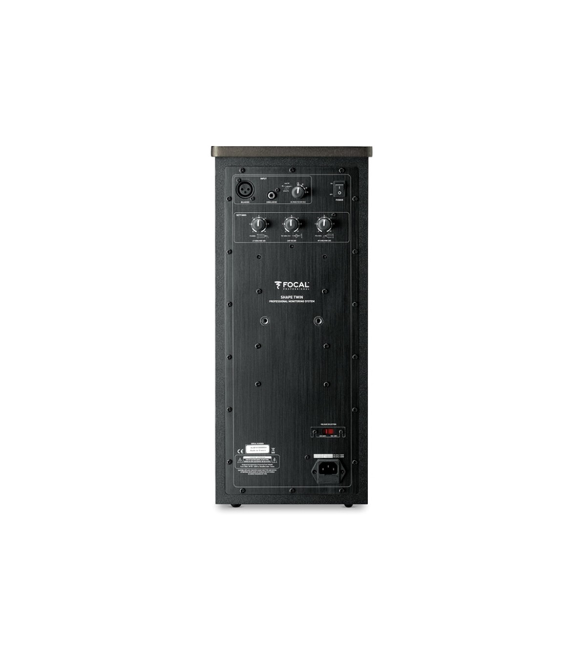 Focal Shape Twin, monitor nearfield attivo; 2 x 80 + 50 watt classe AB; 2 woofer da 5" flax cone; tweeter: da 1" alluminio-magnesio 'M' shaped; due radiatori passivi laterali da 8"; risposta in frequenza (+/-3 db): 40 Hz - 35 kHz; max spl peak@1m (musical signal): 110,5 dB; impedenza ingressi: 10 kΩ controlli: filtro passa-alti, bassi, medi, alti; power switch; funzione automatica di standby; costruzione: mdf 12 mm; finiture: vinile, legno di noce evernice nera; connettori: xlr bilanciato ed rca sbilanciato con sensitivity compensation; staffa per montaggio a parete ed a soffitto (viti ed accessori non forniti); dimensioni: 478 x 211 x 279 mm; peso: 11 kg.