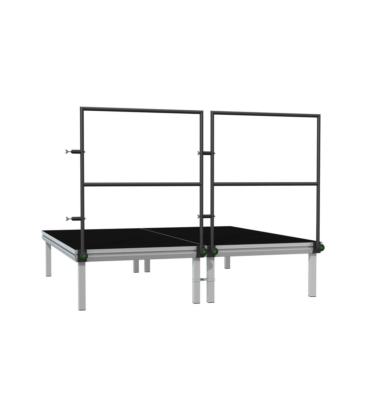 Questo corrimano è progettato per adattarsi al profilo del Deck750. Con 2 connettori serrati a mano è facile e veloce da installare. I corrimano sono dotati di una traversa inferiore aggiuntiva per evitare che oggetti più piccoli scivolino fuori dal palco (ad esempio i flight case). I corrimano adiacenti possono essere collegati insieme con un sistema di connessione a 2 punti per una maggiore stabilità.