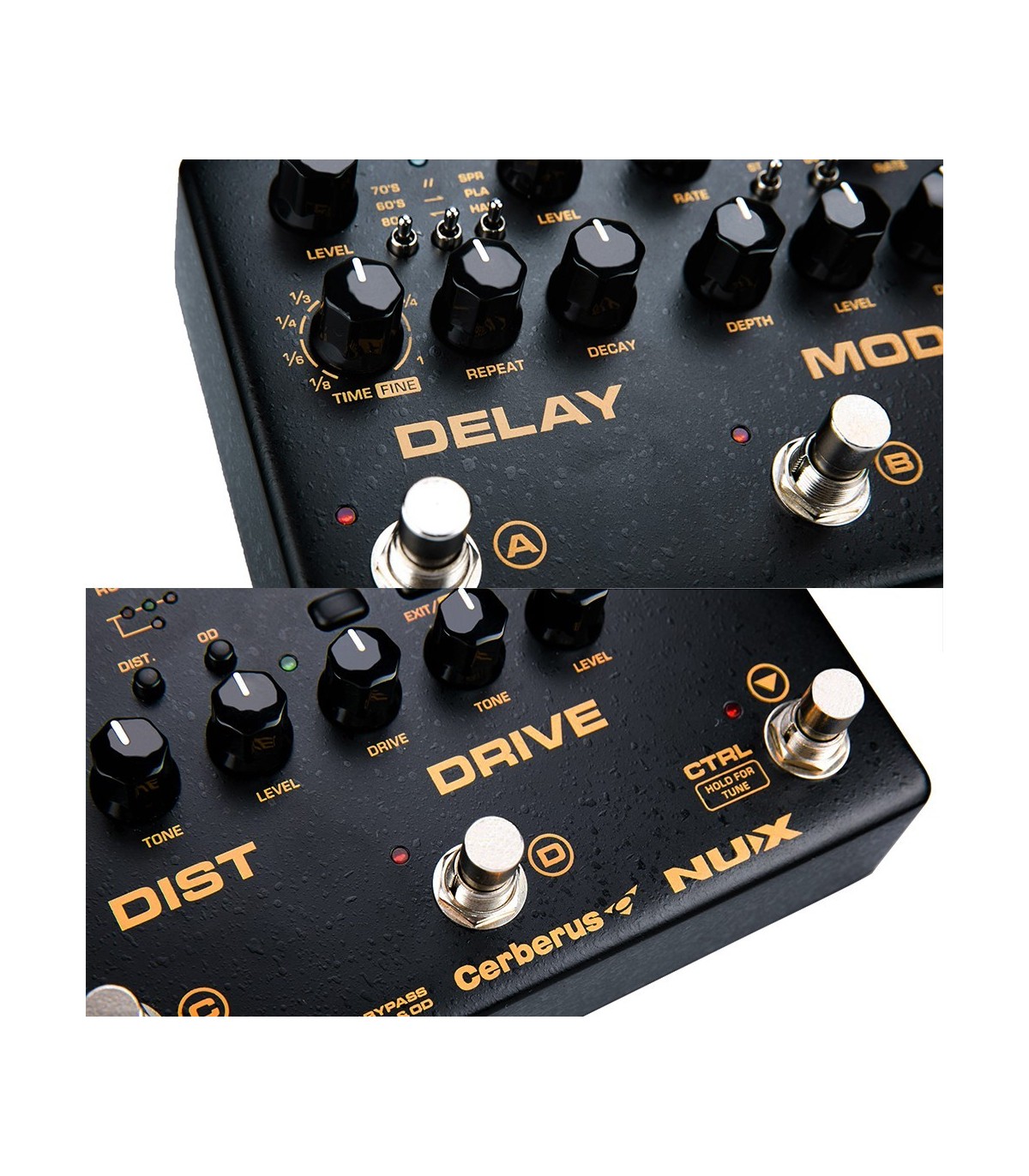 NUX Cerberus è una pedaliera multi FX che unisce la flessibilità degli stompbox alla praticità di un unica device. Offre un incredibile ventaglio di funzioni come routing interno, IR loader, overdrive/distorsore 100% analogici, modulazioni e effetti ambiente. Può essere usato come pedaliera stand alone o essere integrato in una catena di effetti, così come può essere utilizzato in modalità manuale o tramite richiamo di patch salvate in memoria. Il metodo di connessione a 4 cavi tramite FX loop permette di integrare i tuoi equipaggiamenti preferiti nella catena a qualsiasi stadio tu voglia. Cerberus supporta anche il formato MIDI per ampliare il tuo range di opzioni. L'unità prevede 2 effetti 100% analogici (overdrive a distorsore), 3 modulazioni (Tremolo, Phaser, U-Vibe) e ben 9 FX ambiente (3 chorus, 3 delay con Tap tempo e 3 riverberi). Cerberus dispone di uscite stereo, una delle quali funge da simulazione cassa per connessione diretta a PA System o scheda audio. Anche l'uscita cuffie è dotata di simulazione speaker per massima resa nelle tue sessioni di pratica o di registrazione. Cerberus è compatibile con file IR sviluppati anche da terze parti. Altre funzioni comprendono loop switcher, accordatore integrato, IR loader, funzione Kill Dry e Volume Boost (0-20dB).