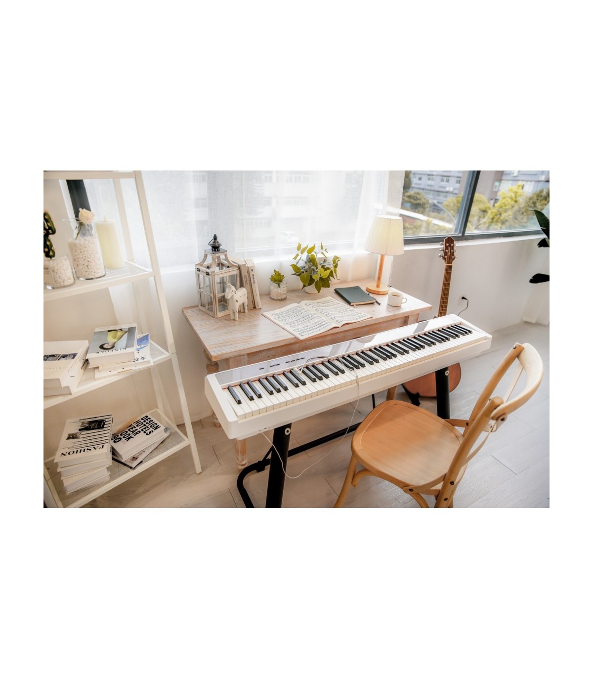 NUX NPK-10 è un piano digitale portatile che non rinuncia alle caratteristiche tipiche dei prodotti di fascia alta quali tasti pesati con triplo sensore e 5 livelli di sensibilità che ricreano il feeling dei tasti in avorio dei veri pianoforti. Ben 12 suoni tra cui Grand Piano, Marimba, Harpsichord, Strings, Organ, Pad. E' possibile utilizzare effetti come Riverbero, Chorus e Delay, aggiustare la brillantezza e creare due layer per ogni suono, salvando poi i preset su due banchi di memoria o registrando la tua canzone. Puoi anche utilizzare il Bluetooth Audio per suonare assieme ai tuoi brani preferiti o il Bluetooth MIDI per controllare il piano con qualsiasi software MIDI. Puoi utilizzare uno dei 12 pattern di batteria della drum machine integrata o esercitarti col metronomo. C'è di tutto e di più in questo piano digitale che offre cose prima impensabili per uno strumento in questa fascia di prezzo.