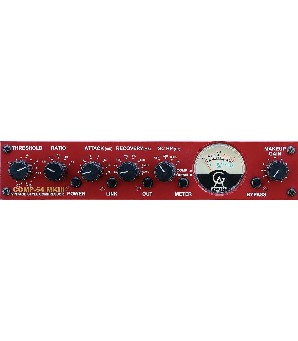 Compressore vintage a un canale, basato sui classici circuiti utilizzati da Neve, EMI ed altri costruttori, realizzato con componenti discreti e trasformatori, equipaggiato con interruttori On/Off, true bypass, compressione In/Out, interruttore link (per l’utilizzo di 2 Comp-54 in stereo), meter comp/output, e terminazione a 600 Ohm per l’utilizzo in serie di apparecchi moderni, regolazione threshold, ratio, attack, release, HPF e gain, indicatore di livello analogico, ingresso XLR/jack da 1/4” bilanciato, uscita XLR/jack da 1/4” bilanciato, connettore link in formato jack da 1/4”, connettore insert in formato jack da 1/4” per il collegamento diretto ad EQ-73 e EQ-81.