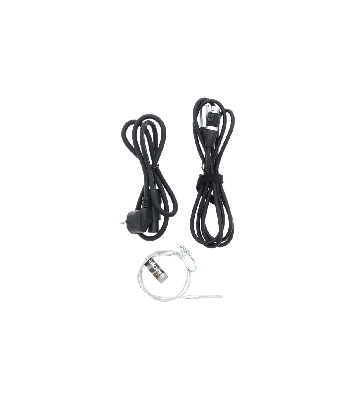 - Fornito con cavo di alimentazione e DMX e relativa fascetta in velcro, doppia staffa di sospensione e imbracatura di sicurezza