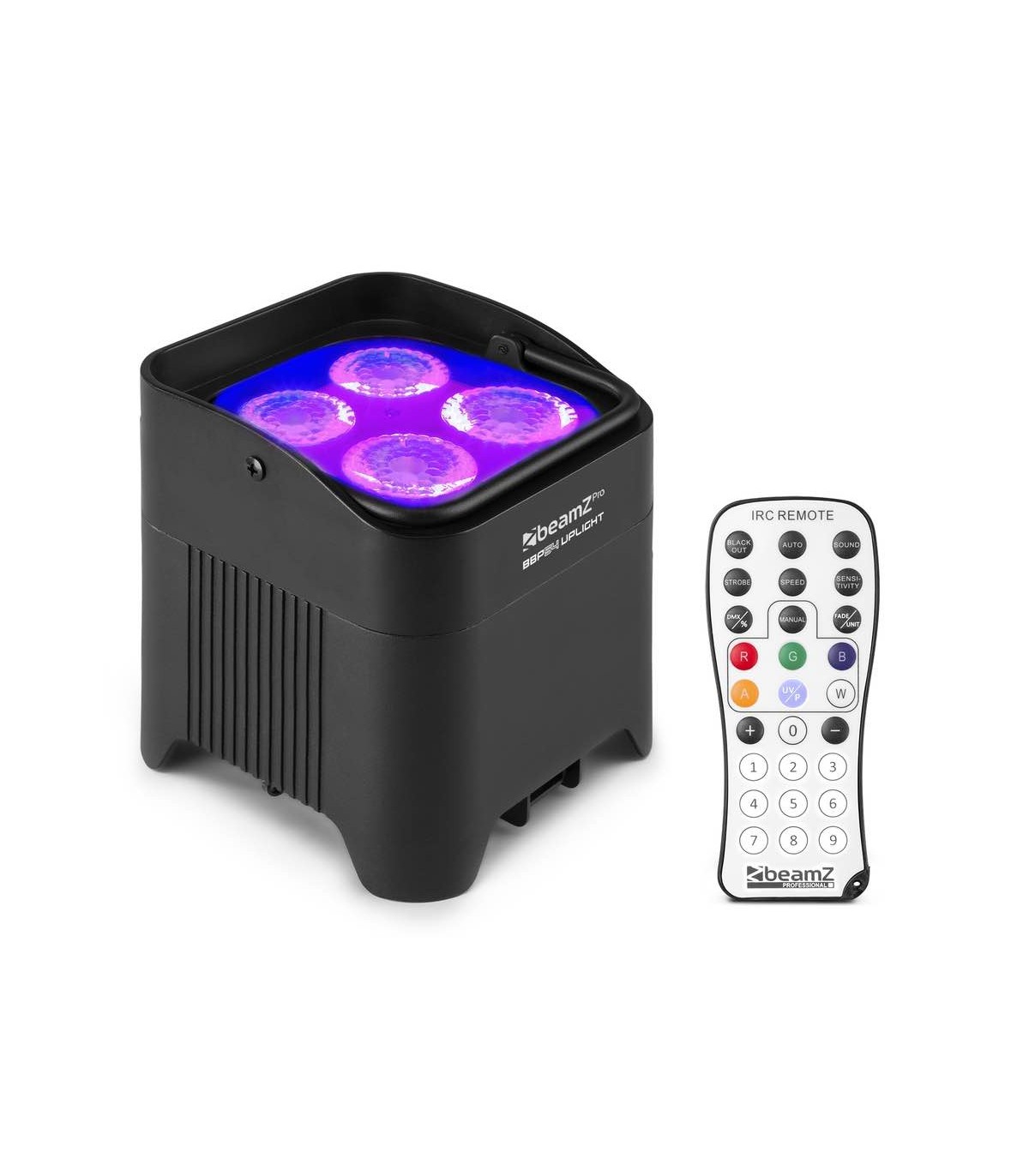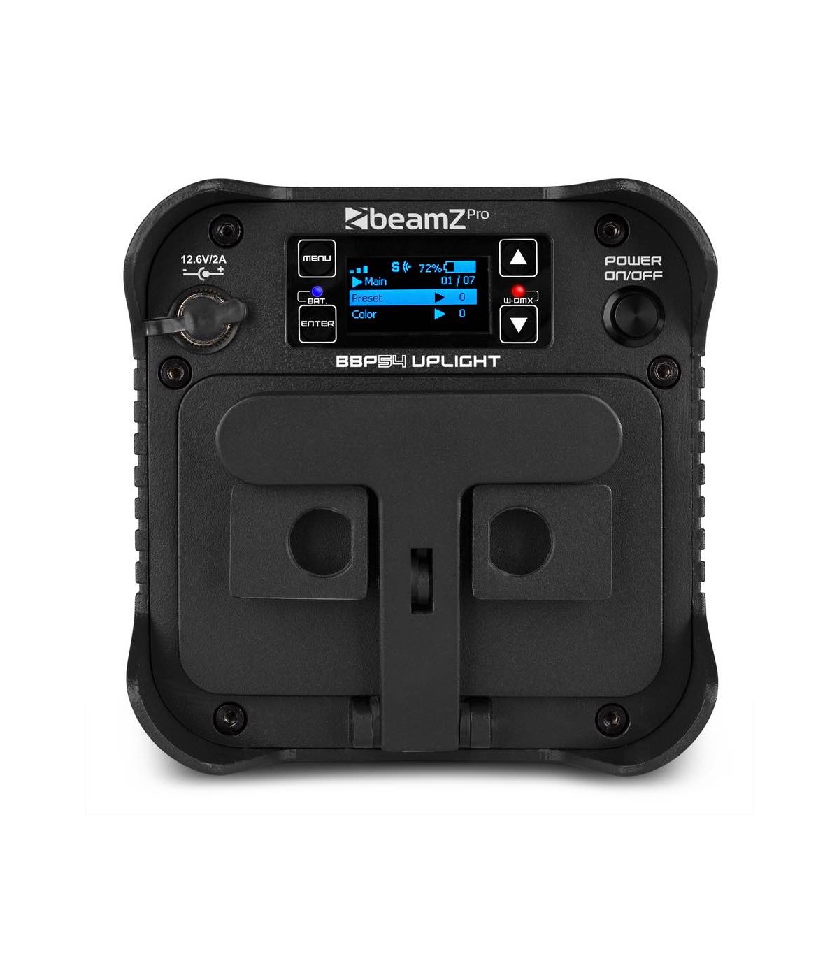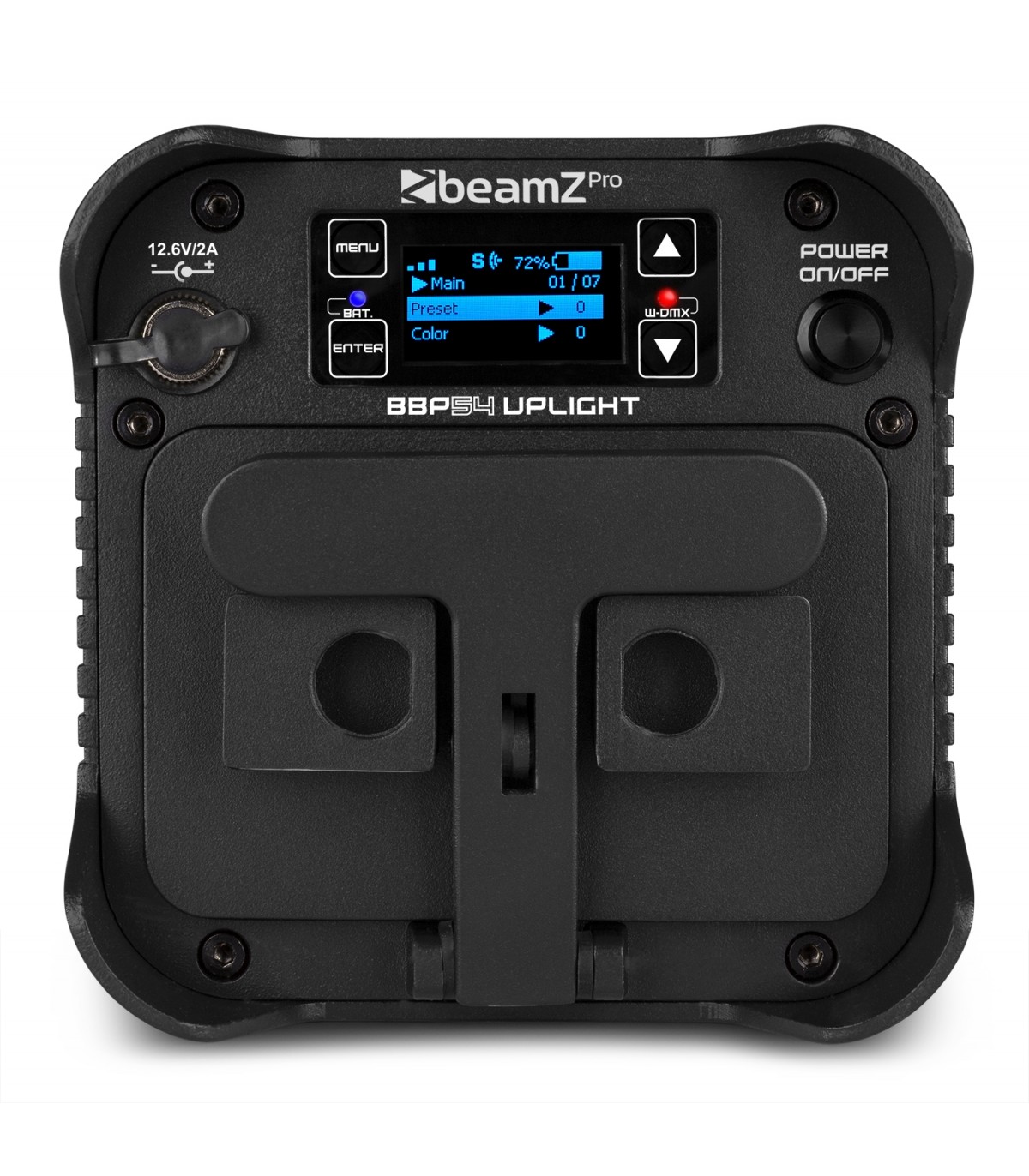 BBP54 è un Par a batteria ideale per l'uso comeUplight. BBP54 è classificato IP65 e quindi è adeguato sia ad uso esterno che interno. BBP54 è dotato di 4x LED RGBAW-UV da 12 W super luminosi e di una batteria integrata rimovibile con autonomia fino a 15 ore , autonomia dipendente a seconda dei colori e dell'intensità utilizzata. Il piedino regolabile può essere posizione con diverse angolazioni. BBP54 può comunicare in vari modi, tramite IR e DMX wireless. Questo rende facile la connessione tra più unità.