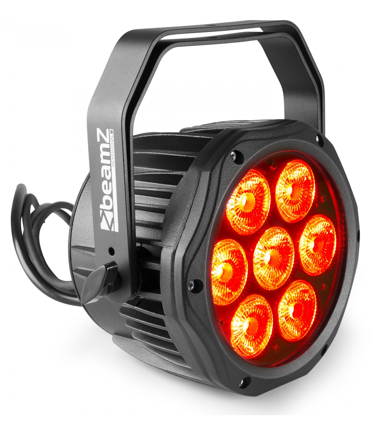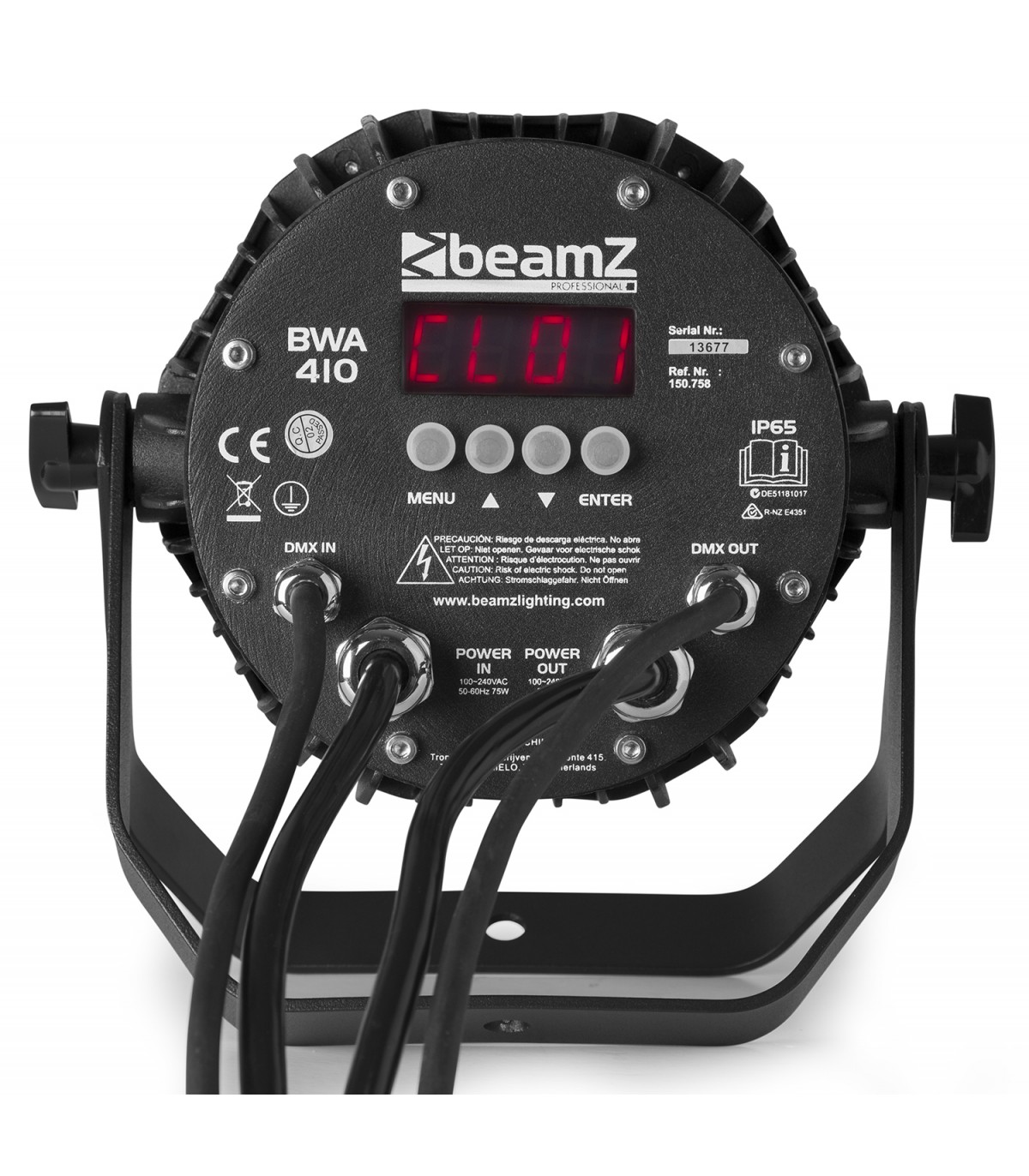 BWA410 Alluminio per esterni LED IP65 Multipar. Con i 7x 10W LED RGBW 4 in 1 ad alta potenza è perfetto per illuminare un edificio o qualsiasi superficie esterna. Resistente all'acqua secondo le specifiche IP65. Include display LED a quattro pulsanti e connettori XLR resistenti all'acqua. Un doppio giogo assicura che il prodotto possa essere montato ovunque l'utente desideri. Nessuna ventola: il calore viene dissipato attraverso l'alloggiamento in alluminio.