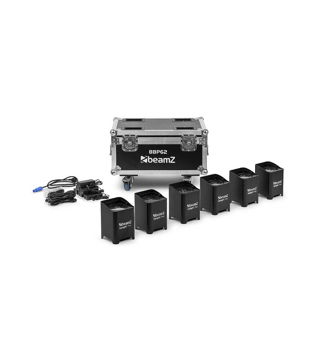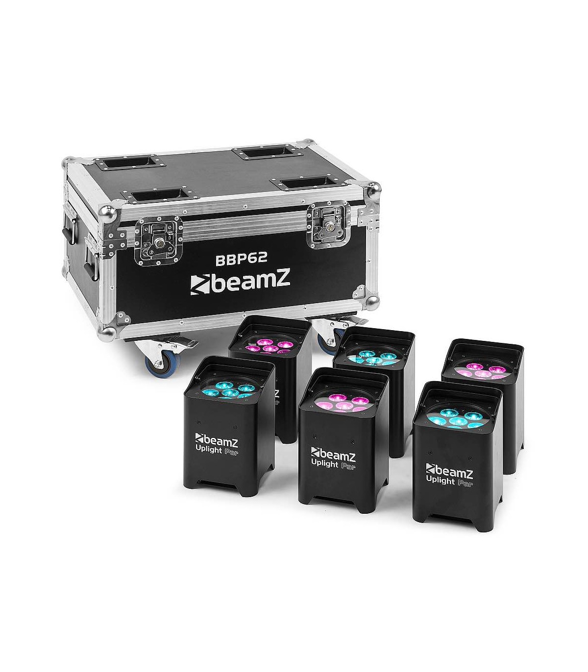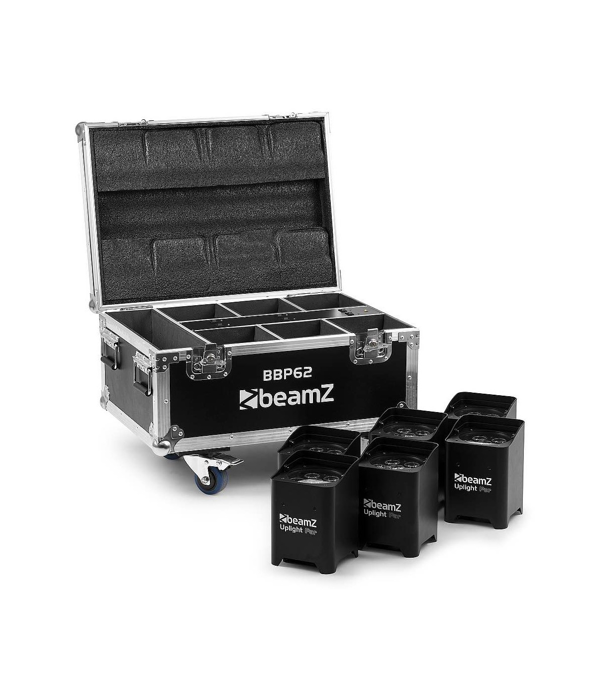Il BBP62 è un set completo di 6 illuminatori BBP62, consegnati in un robusto flight case con stazione di ricarica integrata. Ogni BBP62 è dotato di una potente batteria per oltre 20 ore di funzionamento quando è completamente carica. Dopo ogni evento interno o esterno, i dispositivi possono essere semplicemente riposti nel flight case e ricaricati durante la notte per l'evento successivo. Ogni apparecchio è dotato di un connettore di ricarica appositamente progettato, che consente di caricarlo direttamente nel flight case. Basta collegare il flightcase a una presa di corrente e il gioco è fatto. Questo set viene fornito con un trasmettitore wireless-DMX Eazylink per essere completamente wireless senza la necessità di prodotti aggiuntivi. Può essere facilmente gestito anche tramite Wi-Fi con l'app "LED LAMP".
