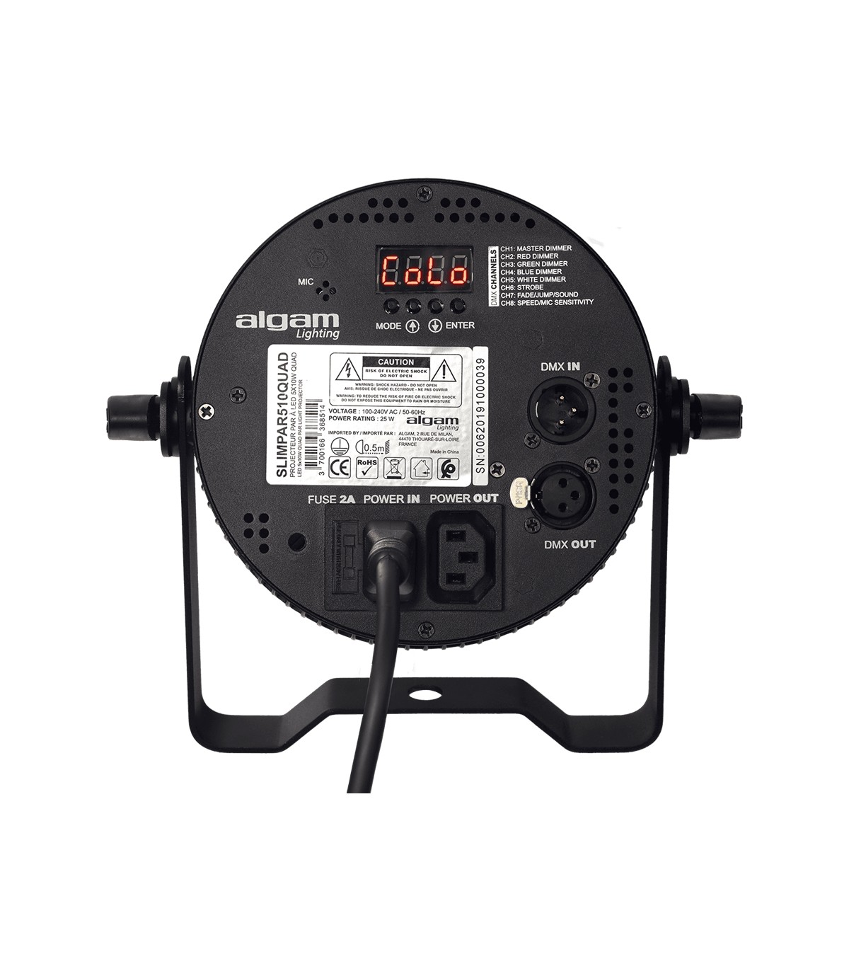 I proiettori LED Algam Lighting SLIMPAR sono una soluzione di illuminazione compatta ed economica per la decorazione o tutti i tipi di eventi interni privati ??o professionali. Questa versione 510-QUAD di Algam Lighting è dotata di 5 LED RGBW da 10 Watt in un profilo sottile, ideale per situazioni in cui lo spazio è limitato, offrendo allo stesso tempo un ampio angolo del fascio di 60°. Versatile e silenzioso, grazie al raffreddamento passivo, questo proiettore può funzionare in modalità automatica o comandata dalla musica. Controllabile tramite DMX o con il telecomando a infrarossi in dotazione, la sua installazione è semplice grazie alla doppia staffa, che ne facilita il posizionamento a pavimento.