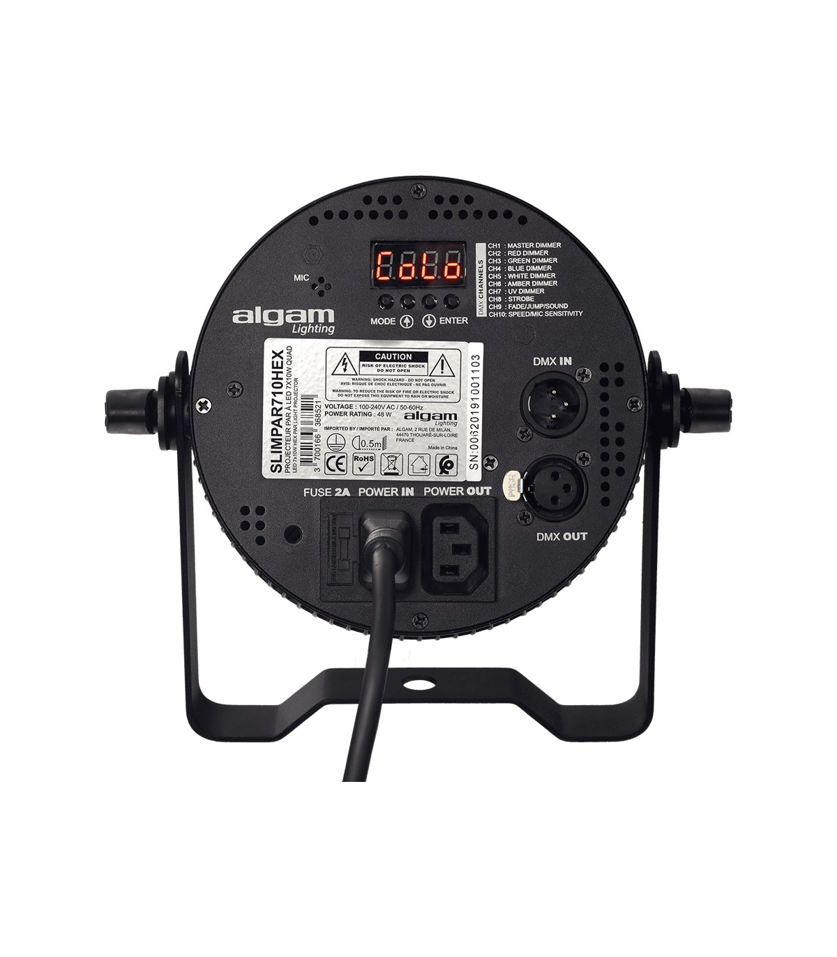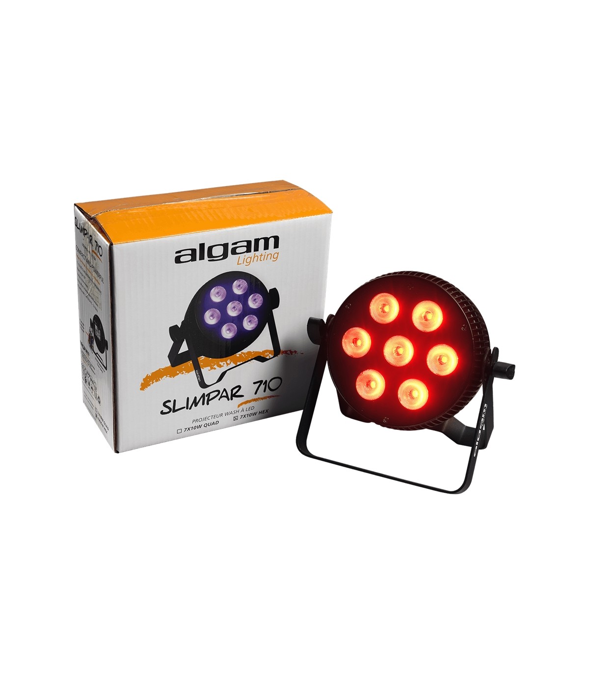 I proiettori LED Algam Lighting SLIMPAR sono una soluzione di illuminazione compatta ed economica per la decorazione o tutti i tipi di eventi interni privati ??o professionali. Questa versione 710-HEX di Algam Lighting è dotata di 7 LED RGBWA+UV da 10 watt in un profilo sottile, ideale per situazioni in cui lo spazio è limitato, offrendo allo stesso tempo un ampio angolo del fascio di 60°. Versatile e silenzioso, grazie al raffreddamento passivo, questo proiettore può funzionare in modalità automatica o comandata dalla musica. Controllabile tramite DMX o con il telecomando a infrarossi in dotazione, la sua installazione è semplice grazie alla doppia staffa, che ne facilita il posizionamento a pavimento.