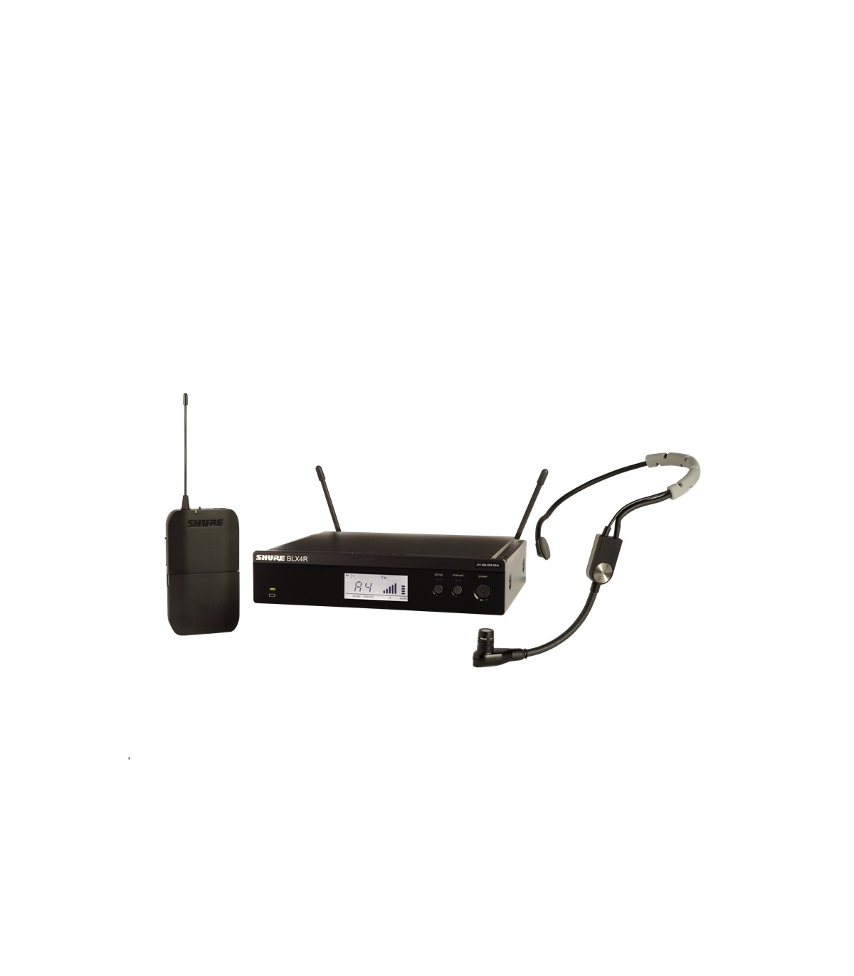 Sistema wireless completo per animatori e cantanti composto da un ricevitore BLX4RE con kit di montaggio a rack singolo/doppio, un trasmettitore bodypack BLX1 e un microfono ad archetto a condensatore, cardioide SM35-TQG. Gamma di frequenze wireless M17: dai 662 ai 686 MHz