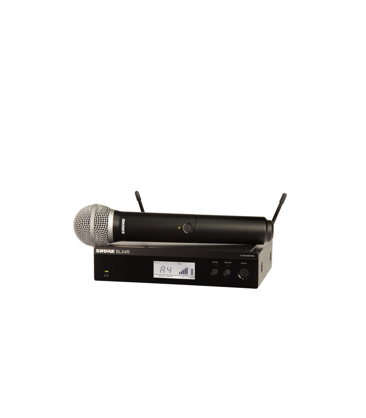 Sistema wireless completo per cantanti e animatori composto da un ricevitore BLX4RE con kit di montaggio a rack singolo/doppio, un trasmettitore gelato BLX2 dotato di una capsula dinamica cardioide PG58 e una pinza microfonica WA371. Gamma di frequenze wireless M17: dai 662 ai 686 MHz.
