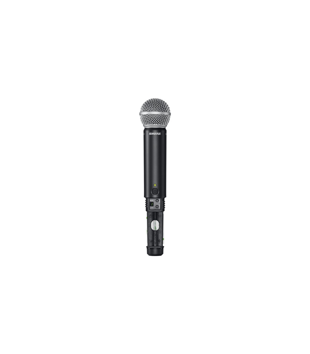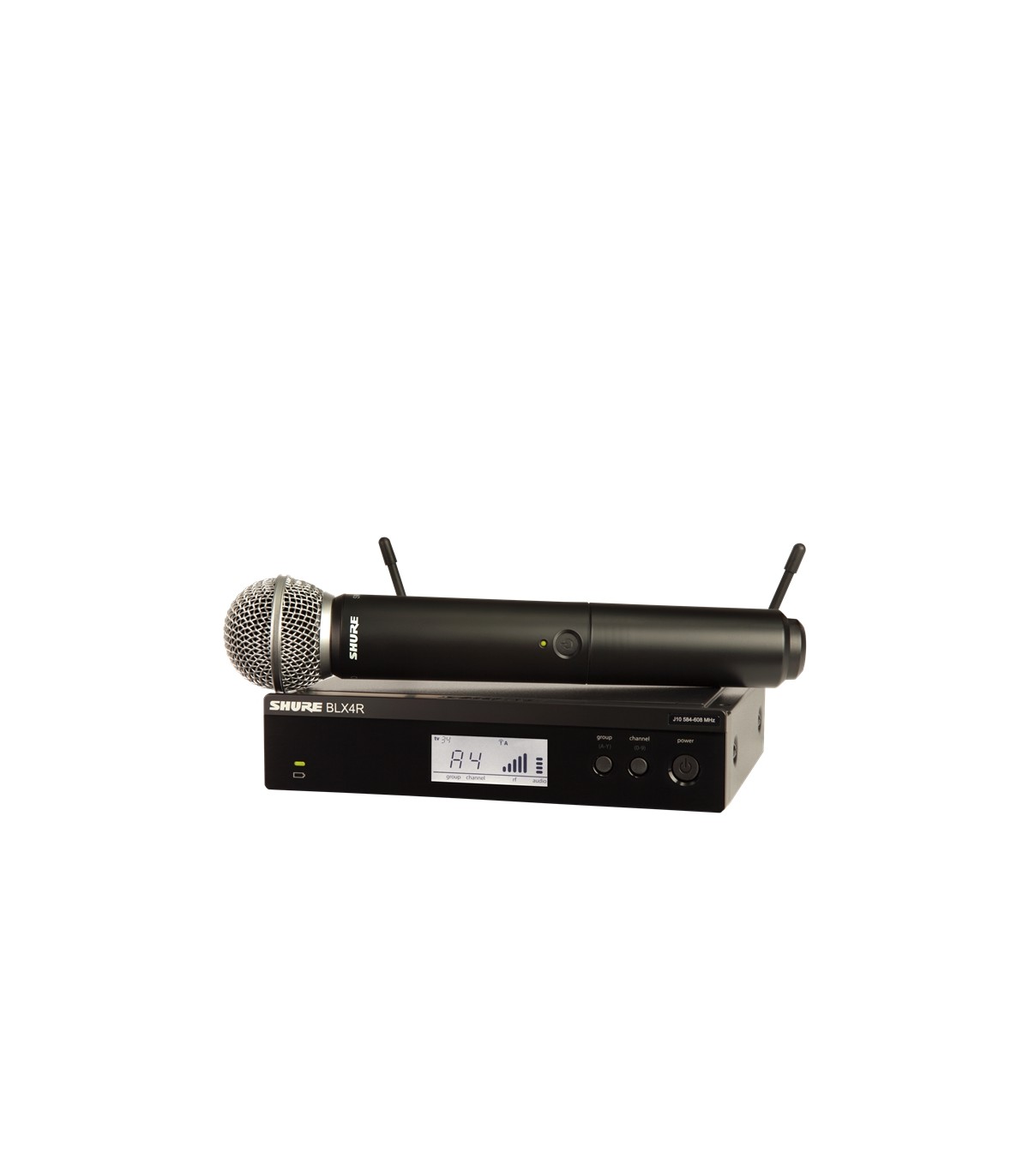 Sistema wireless completo per cantanti e animatori composto da un ricevitore BLX4RE con kit di montaggio a rack singolo/doppio, un trasmettitore gelato BLX2 dotato di una capsula dinamica cardioide SM58 e una pinza microfonica WA371. Gamma di frequenze wireless M17: dai 662 ai 686 MHz.