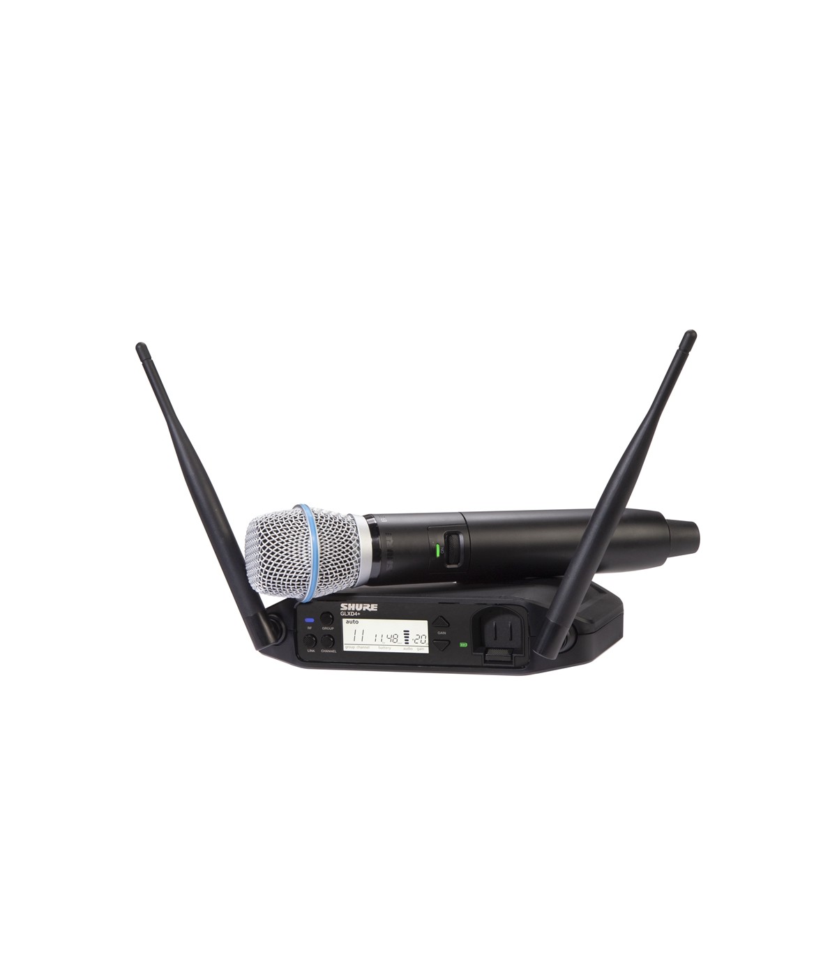 Dotato del microfono a gelato per voce BETA 87A, uno standard affermato sui palchi di tutto il mondo, il sistema vocale GLXD24+/B87A a doppia banda (2.4GHz e 5.8GHz) offre un audio digitale di qualità ed estremamente stabile. La perfetta combinazione della gestione automatica delle frequenze con la nuova tecnologia a doppia banda (2.4GHz e 5.8GHz) garantisce prestazioni affidabili e coerenti, mentre le batterie ricaricabili al litio proprietarie di Shure offrono fino a 12 ore di utilizzo. Il sistema include il trasmettitore palmare GLXD2+/B87A e il ricevitore da tavolo GLXD4+.