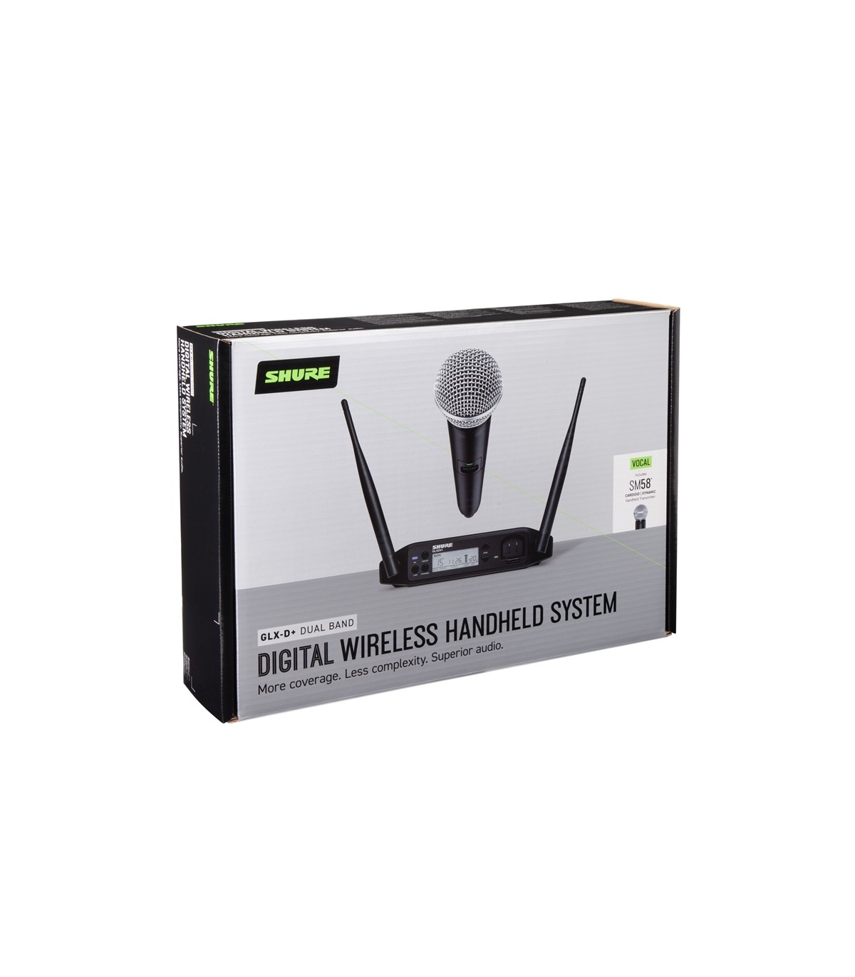 Caratterizzato dal microfono a gelato Shure SM58, uno standard dell'industria, il sistema vocale GLXD24+/SM58 a doppia banda (2.4GHz e 5.8GHz) offre un audio digitale superiore e trasparente. La perfetta combinazione della gestione automatica delle frequenze con la nuova tecnologia a doppia banda (2.4GHz e 5.8GHz) garantisce prestazioni affidabili, mentre le batterie ricaricabili al litio proprietarie di Shure offrono fino a 12 ore di utilizzo. Il sistema include il trasmettitore palmare GLXD2+/SM58 e il ricevitore da tavolo GLXD4+.
