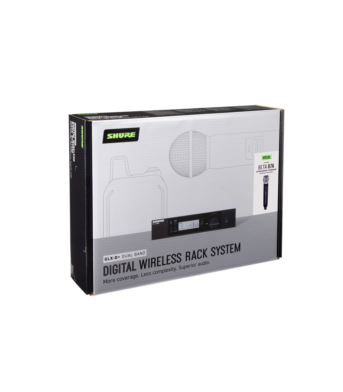 Basato sul microfono per voce a gelato BETA 87A, il sistema wireless per voce GLXD24R+/B87A a doppia banda (2.4GHz e 5.8GHz) offre un audio digitale superiore e trasparente. La perfetta combinazione della gestione automatica delle frequenze con la nuova tecnologia a doppia banda (2.4GHz e 5.8GHz) garantisce prestazioni affidabili e coerenti, mentre le batterie ricaricabili al litio proprietarie di Shure offrono fino a 12 ore di utilizzo. Il sistema include il trasmettitore palmare GLXD2+/B87A e il ricevitore GLXD4R+ a mezza unità rack.