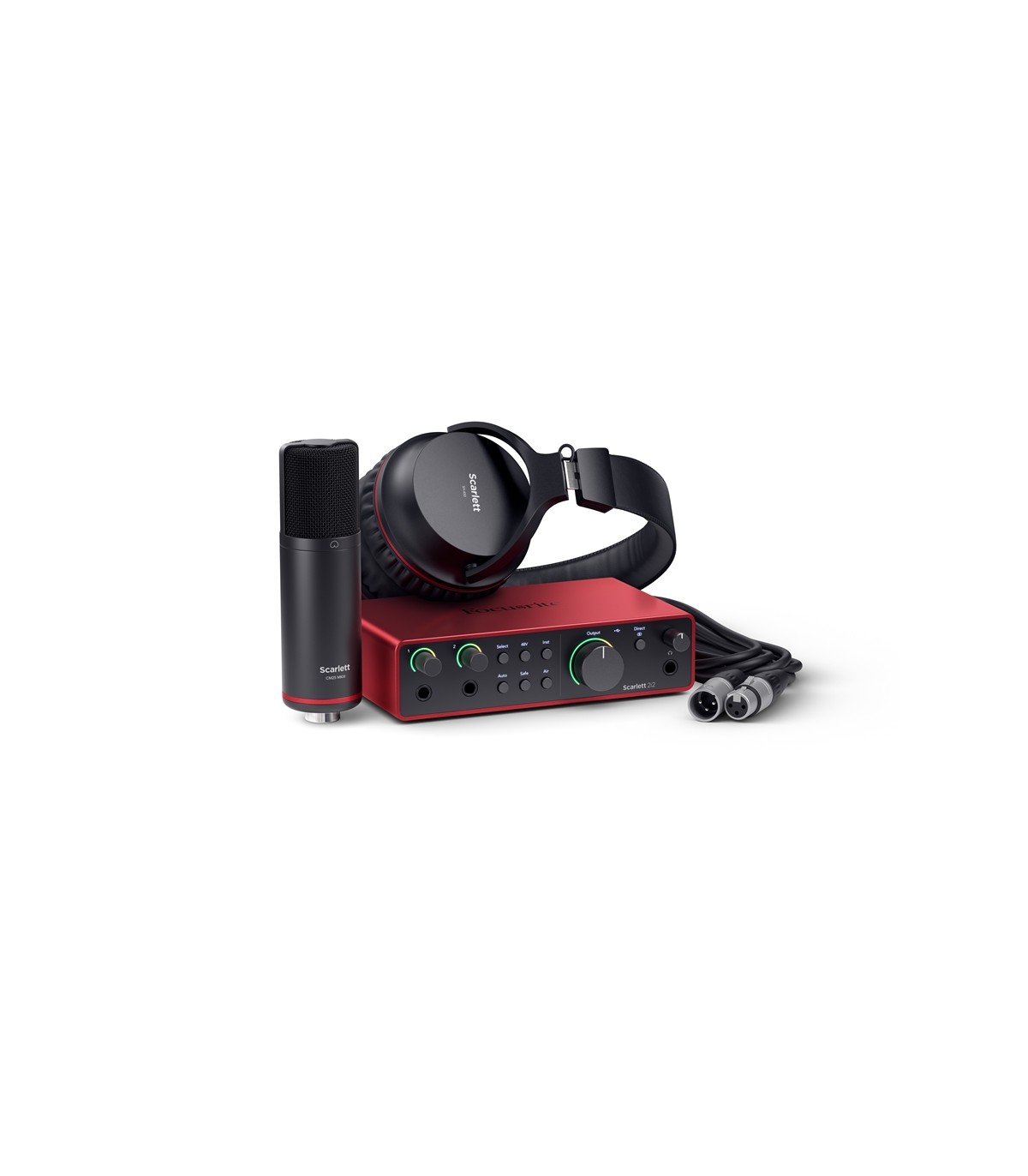 Focusrite Scarlett 2i2 Studio di 4a Generazione è un pacchetto completo per la registrazione che comprende un’interfaccia audio USB a 24bit/192kHz, dotata di due ingressi commutabili tra XLR, con preamplificatori microfonici da ben 69dB di Gain, e jack line/instrument, il microfono a condensatore con pattern cardioide CM25 (MKIII), il rispettivo cavo XLR da 3 metri, un filtro anti-pop in spugna e la cuffia chiusaSH-450. Sugli ingressi dell’interfaccia 2i2 4th Gen. troviamo le funzioni Auto Gain, Clip Safe e la funzione Air con e senza saturazione. Controlli di volume separati per le uscite Master e Cuffia. Canale virtuale Loopback.
