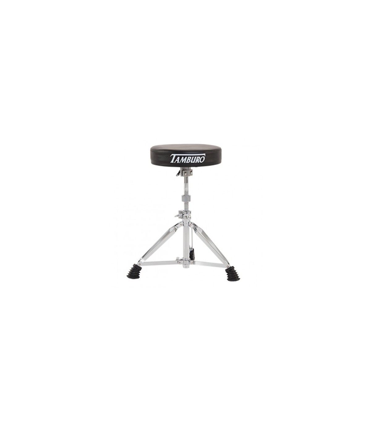 Sgabello per batteria ad altezza regolabile con barra filettata dotata di ghiera di bloccaggio ad incastro per un fissaggio stabile e sicuro. Gambe a doppio braccio.
