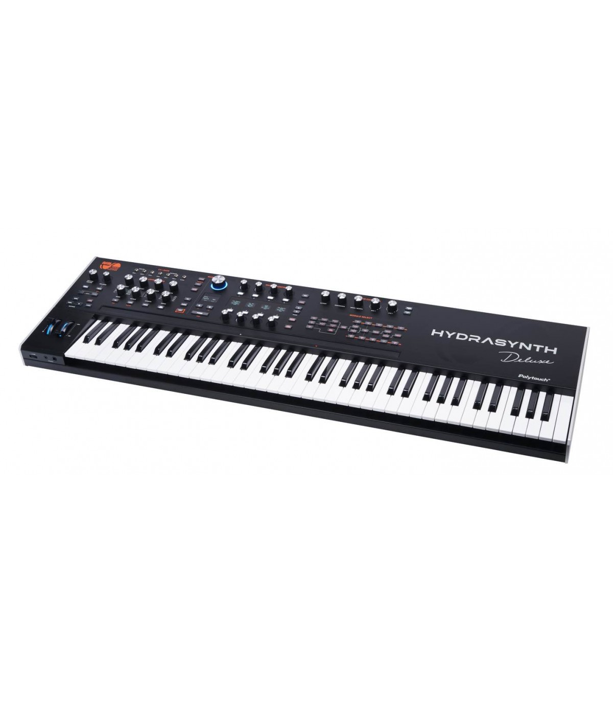 Sintetizzatore wavetable a 16 voci (espandibili collegando un secondo Hydrasynth), con motore di sintesi estremamente avanzato, dotato di 3 oscillatori con numerosi mutator (FM-Linear, Wavestack, Hard Sync, Pulse Width, PW-Squeeze, PW-ASM, Harmonic Sweep), 2 filtri utilizzabili in serie o in parallelo, 4 modificatori di inviluppo (HAHDSR), 5 LFO, una avanzata matrice di modulazione, oltre ad effetti ed arpeggiatore, 5 banchi di memoria da 128 patch ciascunoo, 5 display OLED, tastiera a 73 tasti standard con velocity e aftertouch polifonico, ribbon controller a 4 ottave, ruote pitch bend e modulation, 4 uscite audio da 6,3 mm, 2 uscite cuffie con regolazione volume, MIDI In/Out/Thru, porta USB per uso come interfaccia USB/MIDI, ingressi e uscite CV/GATE compatibili con il voltaggio standard Eurorack e Japanese Volts>Hz, ingressi per pedale di espressione assegnabile pedale di sustain, dimensioni mm 1129 x 346 x 92, peso kg 13.3, alimentatore esterno incluso. N.B. Per l’uso della porta USB/MIDI verificare nel sito del costruttore i sistemi operativi Mac e PC attualmente supportati.