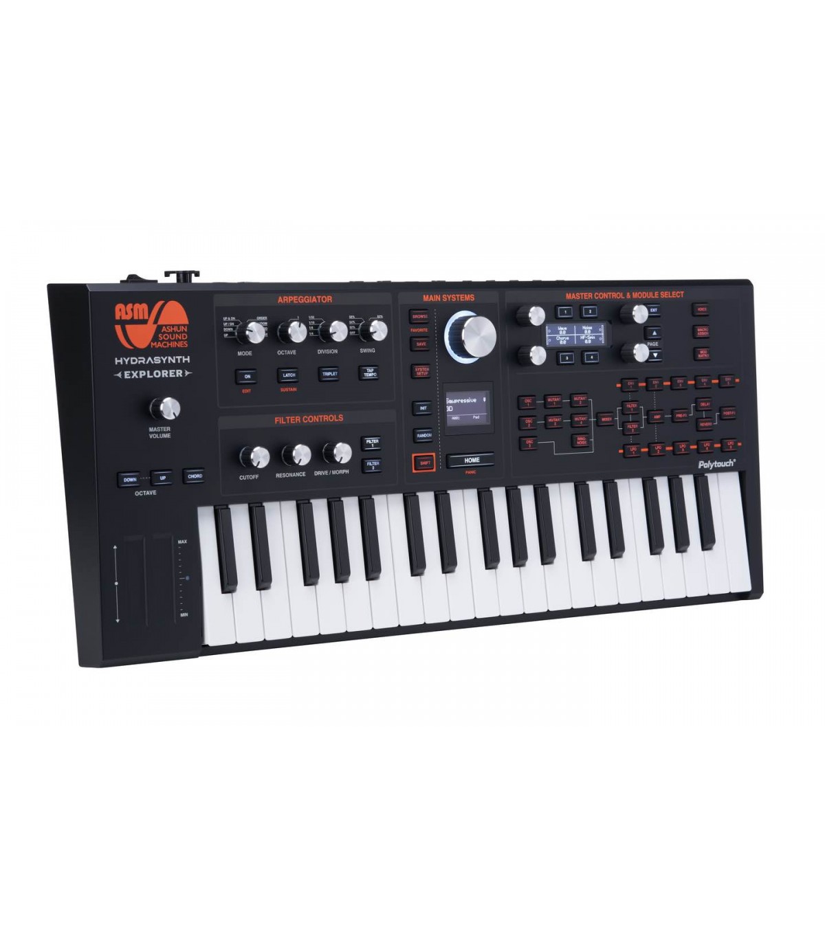 Sintetizzatore wavetable a 8 voci (espandibili collegando un secondo Hydrasynth), con motore di sintesi estremamente avanzato, dotato di 3 oscillatori con numerosi mutator (FM-Linear, Wavestack, Hard Sync, Pulse Width, PW-Squeeze, PW-ASM, Harmonic Sweep), 2 filtri utilizzabili in serie o in parallelo, 4 modificatori di inviluppo (HAHDSR), 5 LFO, una avanzata matrice di modulazione, oltre ad effetti ed arpeggiatore, 5 banchi di memoria da 128 patch ciascunoo, 2 display OLED, tastiera a 37 tasti mini con velocity e aftertouch polifonico, ruote pitch bend e modulation, 2 uscite audio da 6,3 mm, uscita cuffie, MIDI In/Out, porta USB per uso come interfaccia USB/MIDI, uscite CV/GATE compatibili con il voltaggio standard Eurorack e Japanese Volts>Hz, ingresso per pedale di sustain, dimensioni mm 554 x 247 x 70, peso kg 3.46, alimentatore esterno incluso e possibilità di alimentazone con 8 pile AA (non incluse). N.B. Per l’uso della porta USB/MIDI verificare nel sito del costruttore i sistemi operativi Mac e PC attualmente supportati.