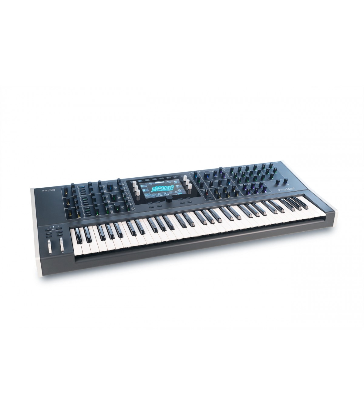 Sintetizzatore polifonico ibrido a 16 voci, modello di punta di Waldorf, con sintesi ibrida digitale e analogica per offrire suoni futuristici possibili solo con i synth software altamente programmabili di oggi, equipaggiato con tastiera dinamica a 61 tasti di alta qualità con aftertouch polifonico, ruote pitch bend e modulation assegnabili, display touchscreen di grandi dimensioni, 80 manopole e 38 pulsanti, dual-sound (split o layer), fino a 10000 preset, memoria flash interna da 59 GB (preset, sample, wavetables) e slot per schede SD, 3 oscillatori digitali (wavetable, classical, granular sampler, resonator), 2 filtri lowpass analogici e filtri digitali i multimodali, 6 LFO, arpeggiatore, campionamento, registrazione audio stereo, step sequencer con step recording, automazione parametri, quantizzazione pitch basata su scala, 5 effetti, 2 ingressi audio da 1/4", 2+2 uscite audio da 1/4" (main e aux), prese USB tipo B (per il collegamento al computer) e tipo A (per il collegamento di controller USB/MIDI), prese MIDI In/Out/Thru/USB, ingressi per pedale sustain e expression (assegnabile), alimentazione 110-240V, dimensioni 1005 x 130 x 400 mm, peso 17,7 kg. N.B. Verificare nel sito del costruttore i requisiti minimi di sistema e i sistemi operativi Mac e PC attualmente supportati.