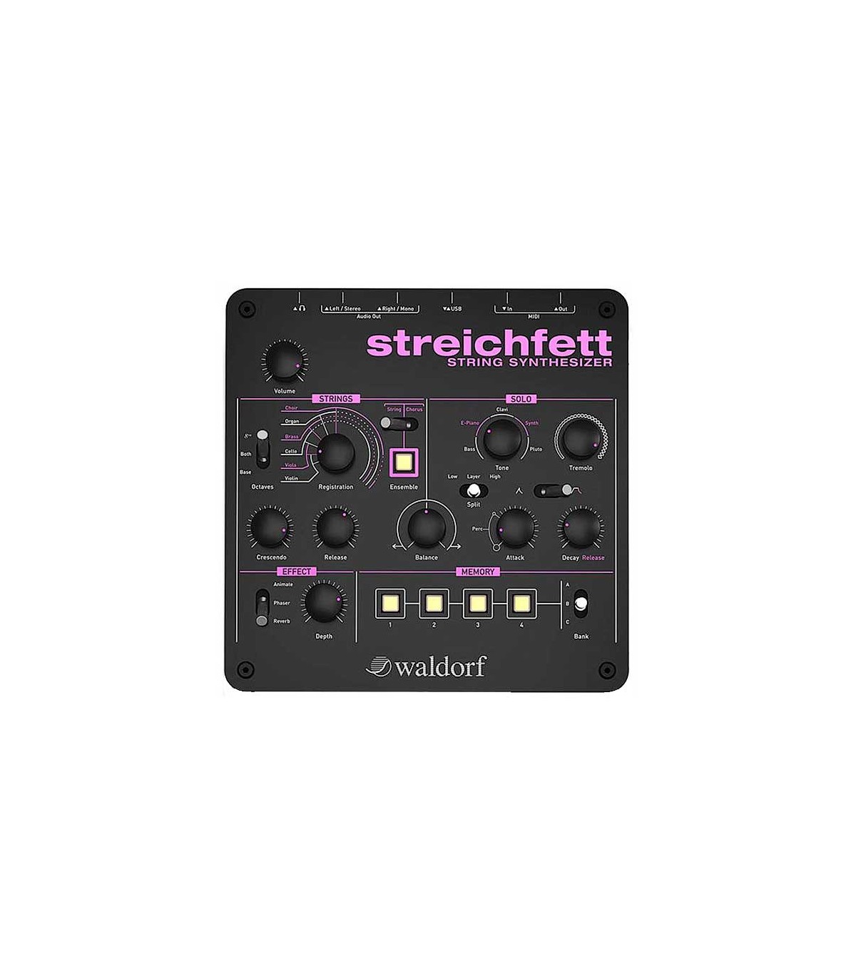 Sintetizzatore che combina il meglio dei synth di archi degli anni 70 e primi anni 80, caratterizzato da doppio motore sonoro con una sezione di archi a 128 voci, una sezione Solo a 8 voci, effetti Animate, Ensemble/Chorus, Phaser e Reverb, split/layer per la sezione solo, 12 preset programmabili, formato tabletop equipaggiato con 8 potenziometri, 1 encoder, 5 pulsanti retroilluminati, 6 interruttori, 2 uscite audio da 1/4", uscita stereo 1/8" per cuffie, MIDI In/Out/USB, presa USB di tipo B per il collegamento al computer e l’alimentazione (alimentatore USB incluso), dimensioni 185 x 185 x 65 mm, peso 0,9 kg. N.B. Verificare nel sito del costruttore i requisiti minimi di sistema e i sistemi operativi Mac e PC attualmente supportati.