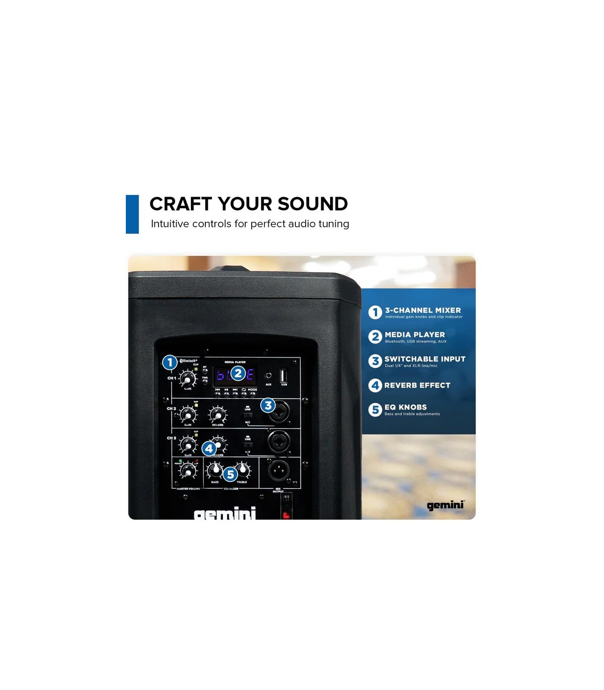 – mixer interno a 3 canali con 2 ingressi linea e 2 ingressi microfonici tutti con regolazione del reverb e ingresso combo XLR-Jack 1/4"