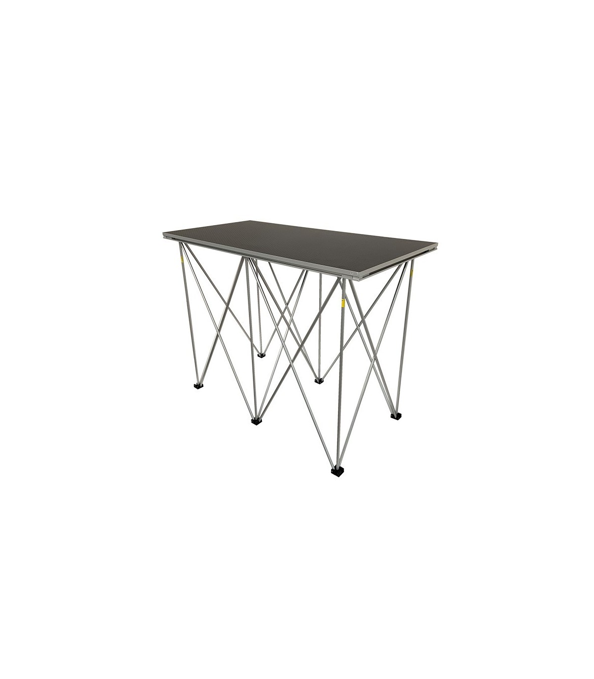 Tavolo “consolle” trasportabile formato da un piano in compensato di betulla rivestito antigraffio e da una struttura telescopica in alluminio pieghevole in appoggio su 6 punti.