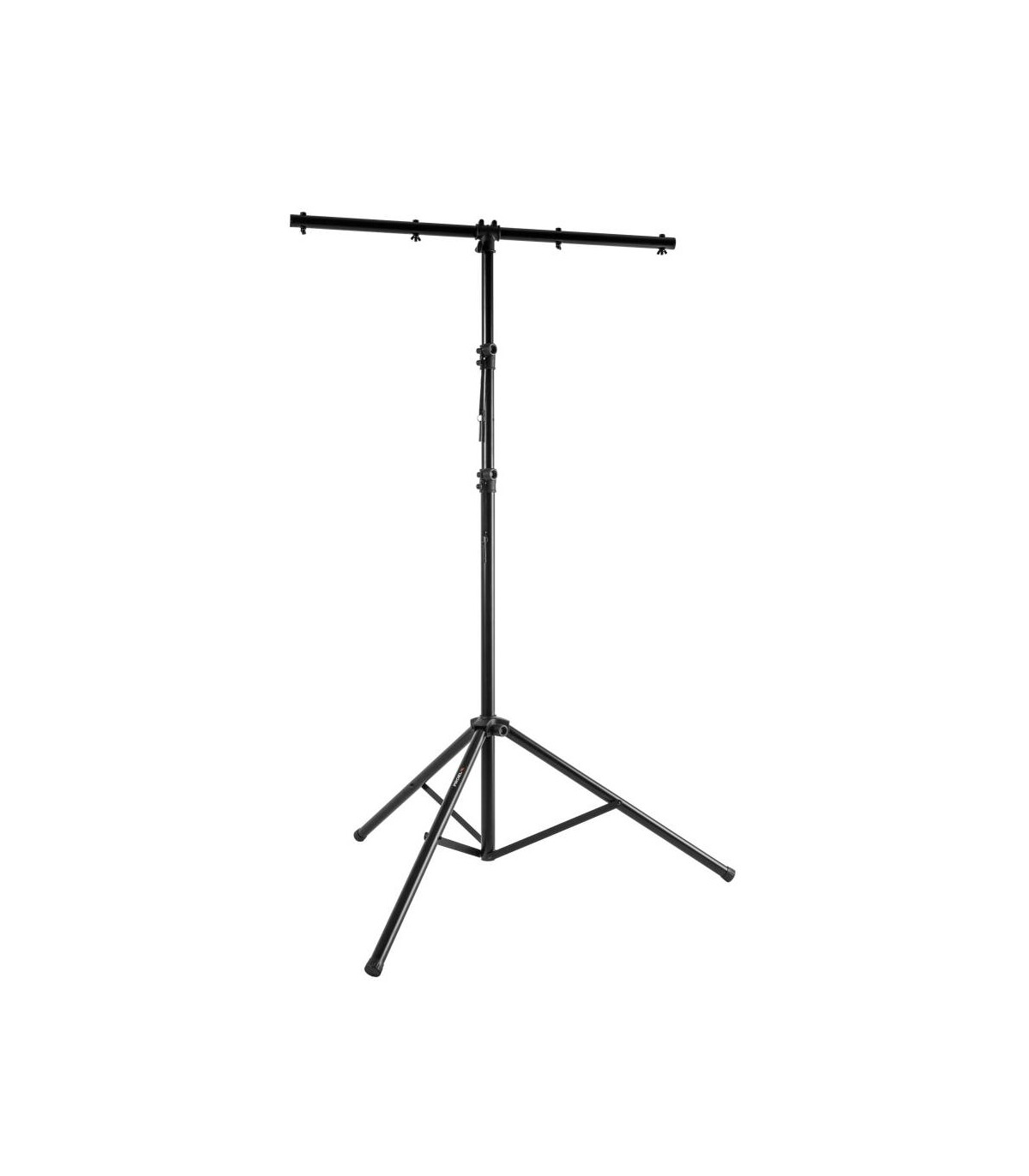 Supporto in alluminio per luci con barra a “T” orizzontale inclusa, per poter posizionare fino ad un massimo n° 8 fari. Snodi della base e del sistema di regolazione in altezza realizzati in nylon caricato con fibra di vetro. Dotato di pin di sicurezza per il sistema di regolazione in altezza. Tubo terminale con Ø 35 mm. Disponibile nel colore nero opaco