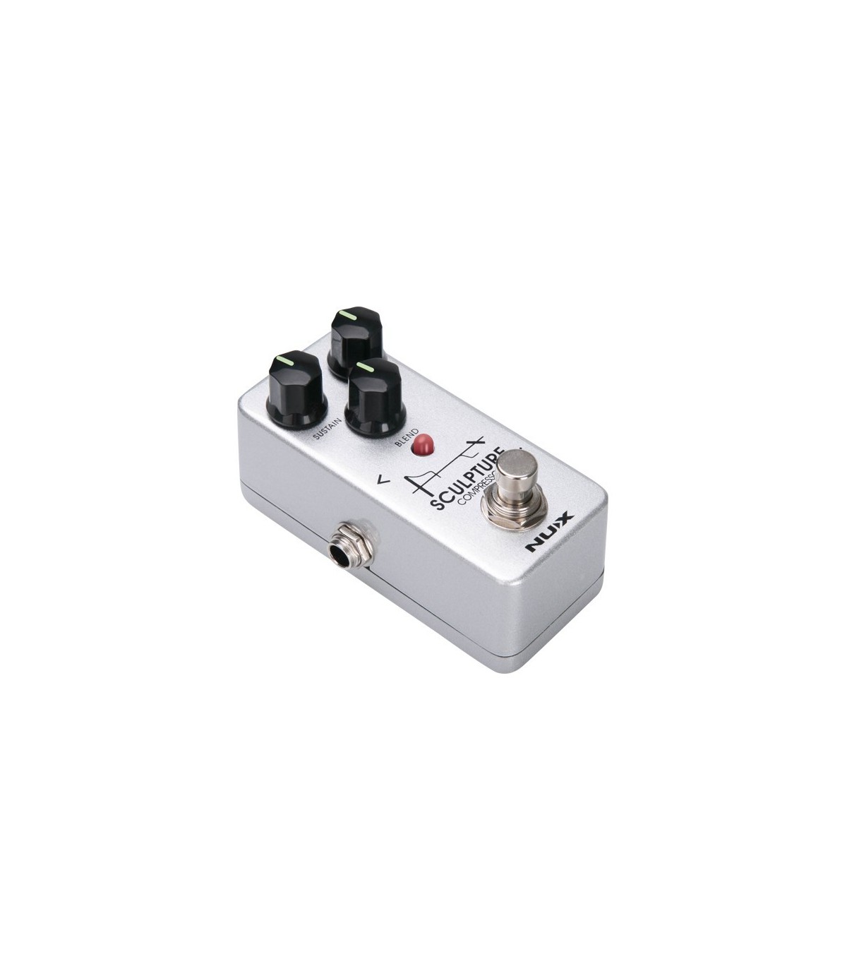NUX Sculpture è un compressore che offre un consistente livello di uscita e arrotonda le frequenze più alte e più basse dello spettro sonoro. Quando tocchi le corde il compressore pulirà le note più alte e aumenterà il sustain complessivo. Lo sculpture può lavorare in due modalità: Clean e Clip mode. La modalità Clean ha un range molto ampio di compressione, ideale per limitare gli humbucker che sforano nello spettro sonoro e per dare una morbida compressione ai single coil. La modalità clip offre invece una compressione molto più aggressiva, perfetta per i generi dove la dinamica va tenuta sotto strettissimo controllo o dove un single coil ha bisogno di sustain aggiuntivo. Il circuito Blend permette di miscelare il segnale compresso con quello non compresso in modo da gestire al meglio il risultato finale. Infine è possibile scegliere la modalità di Bypass richiesta (True Bypass o Buffer).