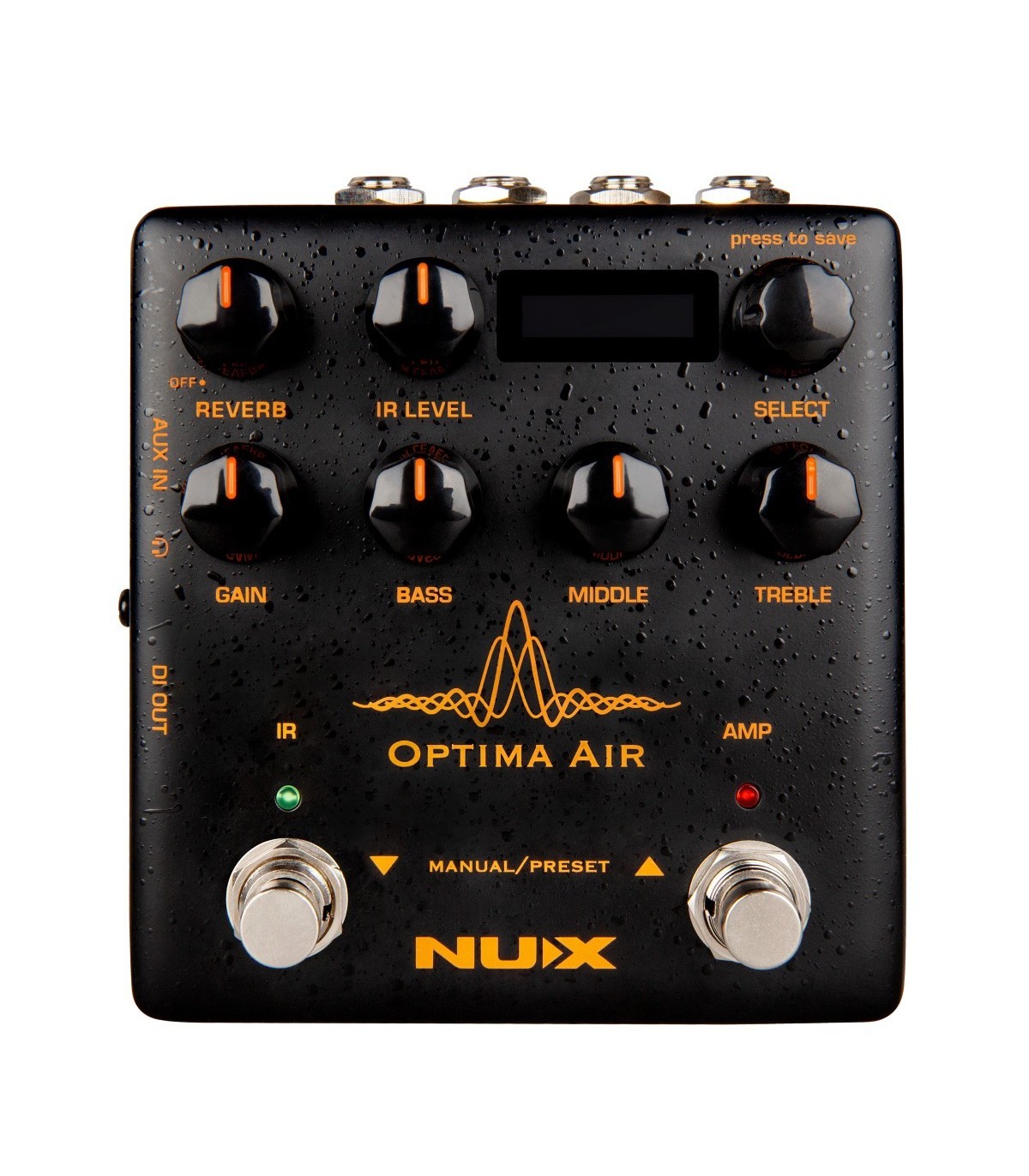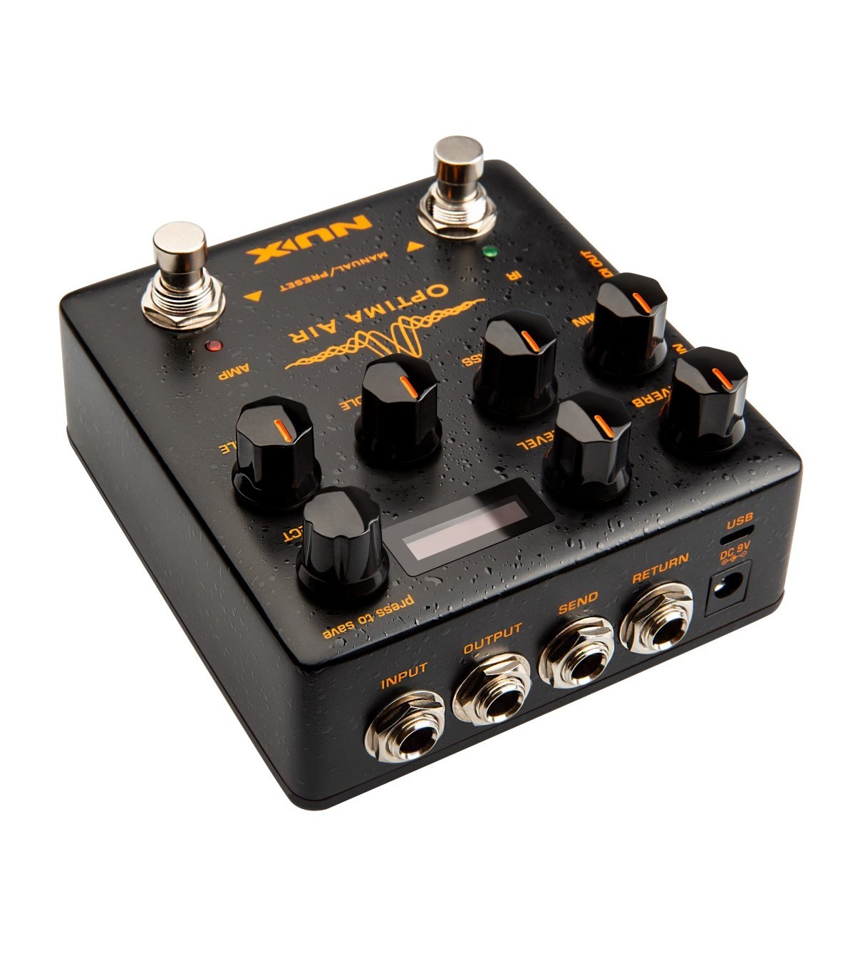 NUX Optima Air è un simulatore acustico con preamp ottimizzato per elettrica e acustica: scegli il profilo di chitarra acustica che vuoi simulare e Optima Air penserà al resto in base al tuo pick up. Dotato di IR loader con 15 simulazioni cassa, profilatore IR, Gain, Eq 3 bande e riverbero integrato, dispone di connessioni cuffia, Aux e FX loop e DI out.