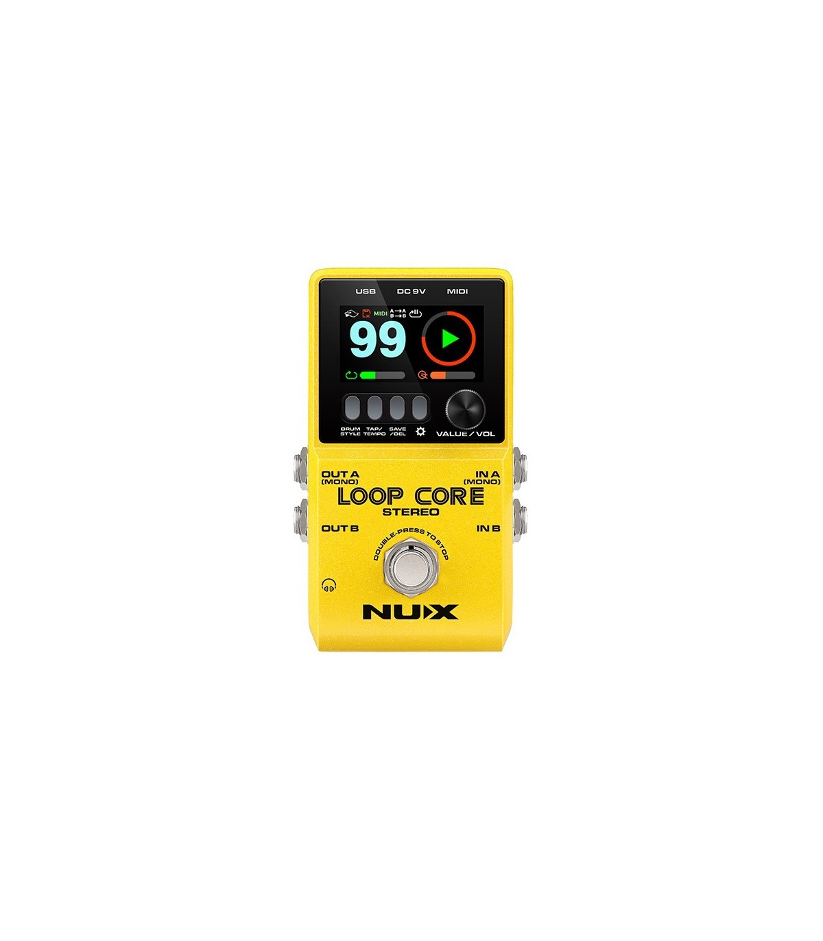 Il Loop Core Stereo appartiene alla nuova generazione di pedali looper targati NUX. È dotato di un display LCD a colori ad alta definizione, di ingressi/uscite stereo, cab simulator, drum machine e di input di controllo MIDI. Consente di registrare le tue frasi musicali e di riprodurle come loop stereo in modo semplice e flessibile. Se ti eserciti, componi o suoni dal vivo, questo pedale ti ispirerà!