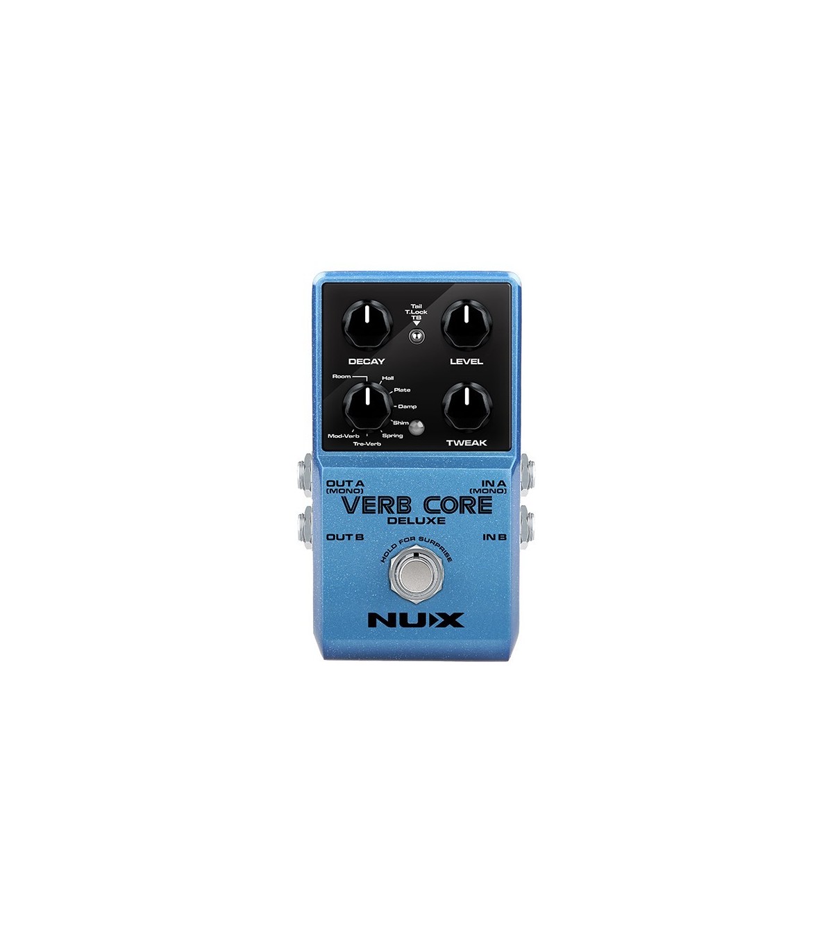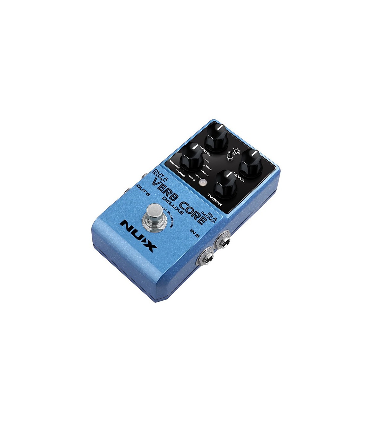 Il NUX VERB CORE DELUXE è un pedale con 8 diversi tipi di riverbero, tra cui Room, Hall, Plate, Damp, Shim, Spring, Tre-Verb e Mod Verb. È possibile selezionare il tipo di riverbero utilizzando il controllo rotativo. VERB CORE DELUXE offre il True-bypass e il Buffer-bypass (Tail); imposta l'interruttore a levetta a tre vie sulla posizione desiderata e il gioco è fatto.