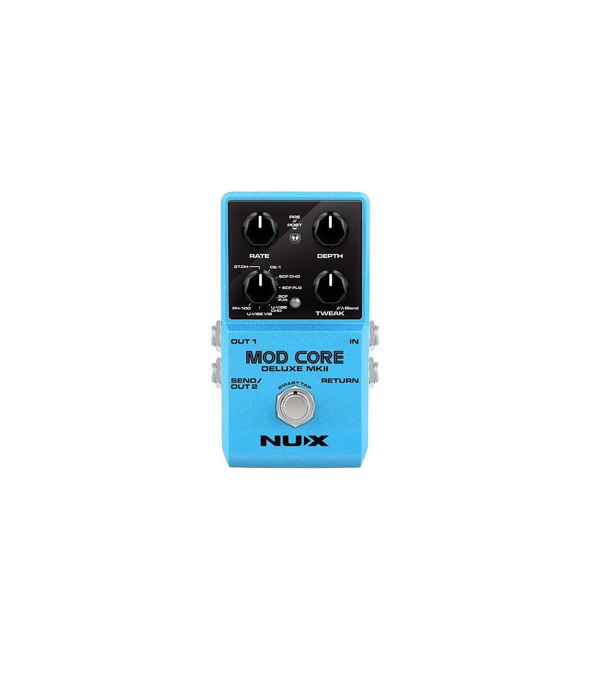 Il NUX MOD CORE DELUXE MKII è un pedale di modulazione con 8 diversi tipi di modulazione, tra cui ST.CH (Stereo Chorus), CE-1, SCF CHO, SCF FLG, SCF P.M., U-VIBE CHO, U-VIBE VIB e PH-100. È possibile commutare i tipi di mod tramite l'interruttore rotante. MOD CORE DELUXE MKII offre un routing avanzato del segnale tramite il Send/Return: puoi anche dividere facilmente il segnale mono per creare loop di effetti personalizzati! Inoltre, è possibile mettere in parallelo i due segnali e utilizzare la manopola Tweak in modalità Alt per miscelare i segnali. Utilizzate l'interruttore a levetta a 3 vie nella posizione desiderata e il gioco è fatto.