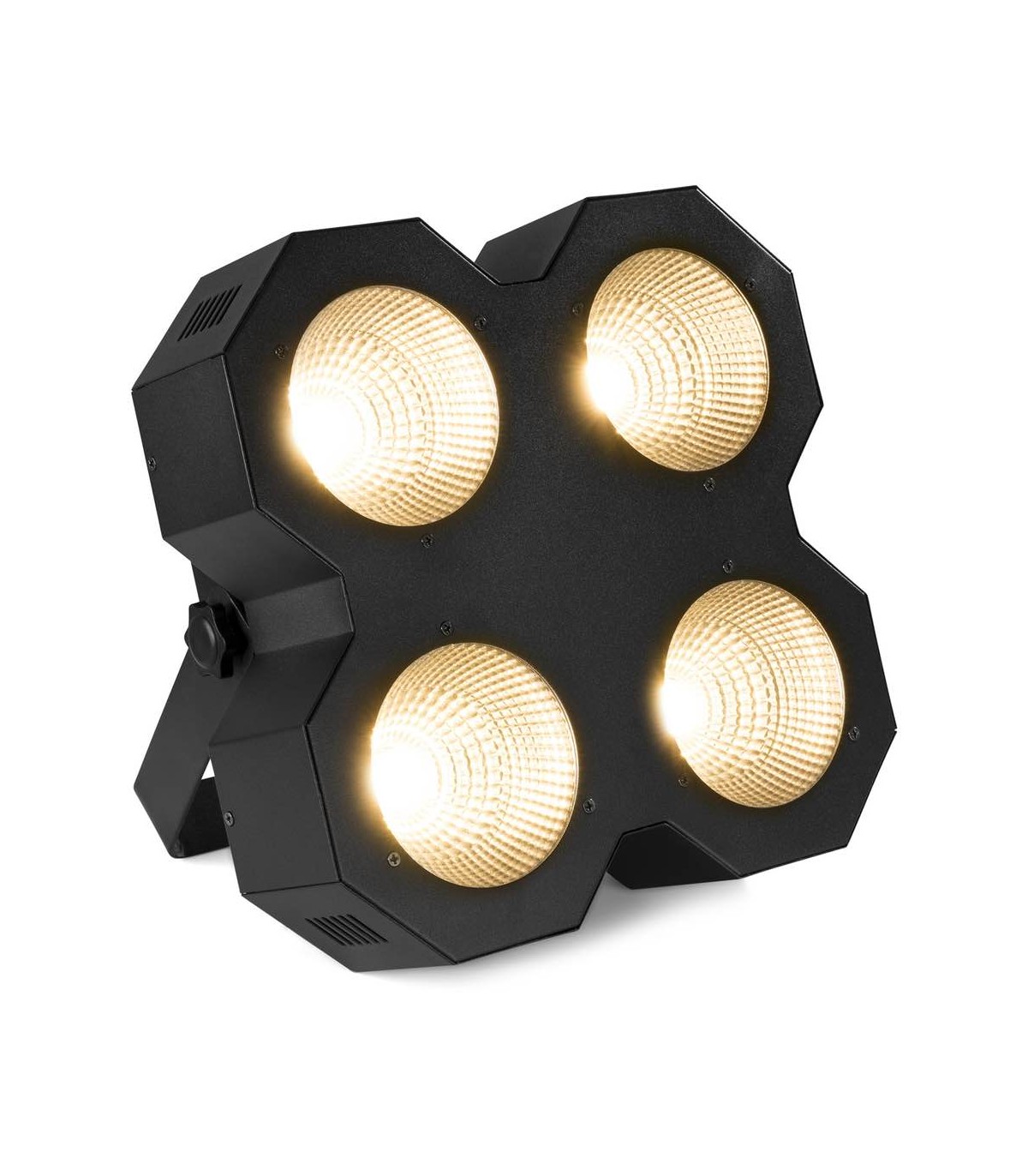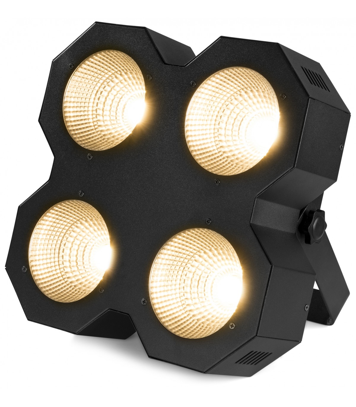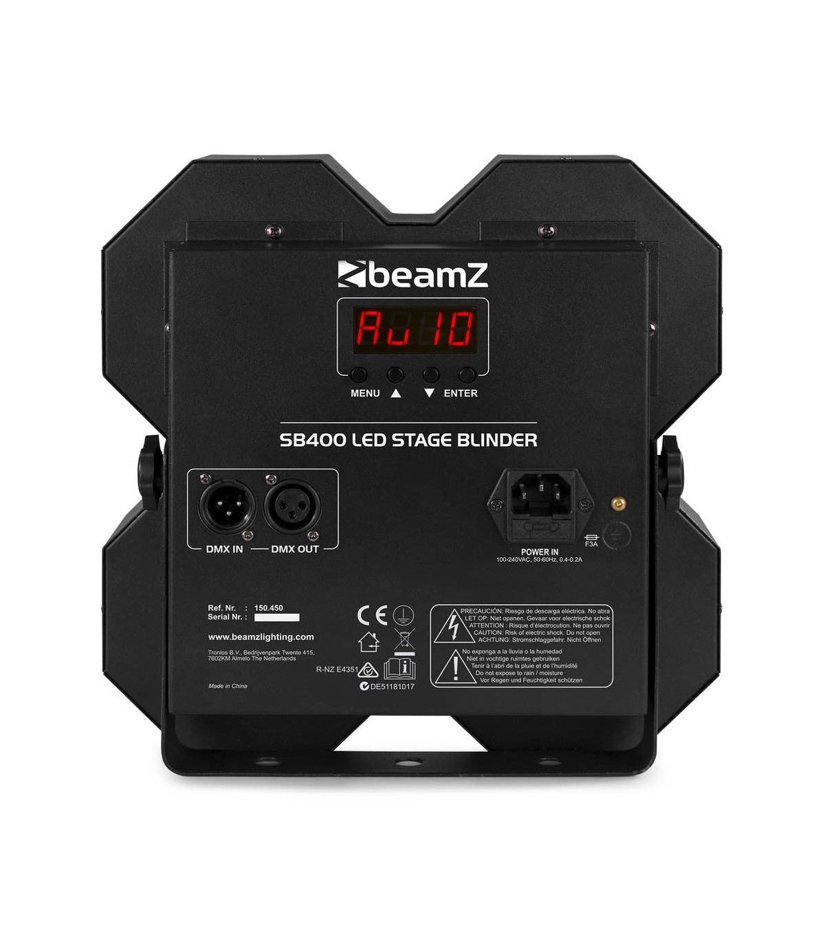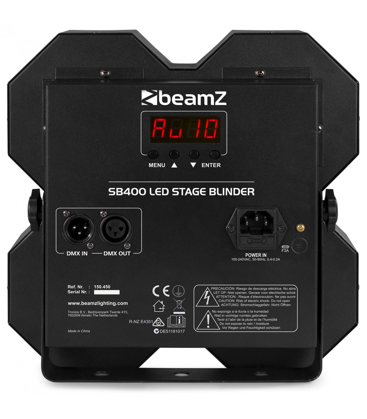 SB400 Stage Blinder è un potente apparecchio di illuminazione a LED con un design robusto dotato di LED da 50 W Chip-on-Board (COB) che combina due effetti nella sua sede. Oltre a uno stage blinder, questo dispositivo può anche essere usato come stroboscopio. L'SB400 combina l'emissione luminosa accecante di un Audience Blinder convenzionale e può essere controllato in modalità stand alone, in modalità di attivazione del suono o direttamente tramite DMX in una modalità a 8 canali. I LED hanno un'aspettativa di vita di 100.000 ore. Il colore dei LED è bianco caldo