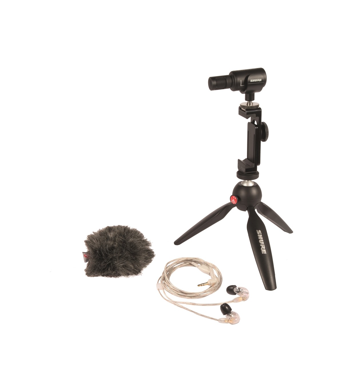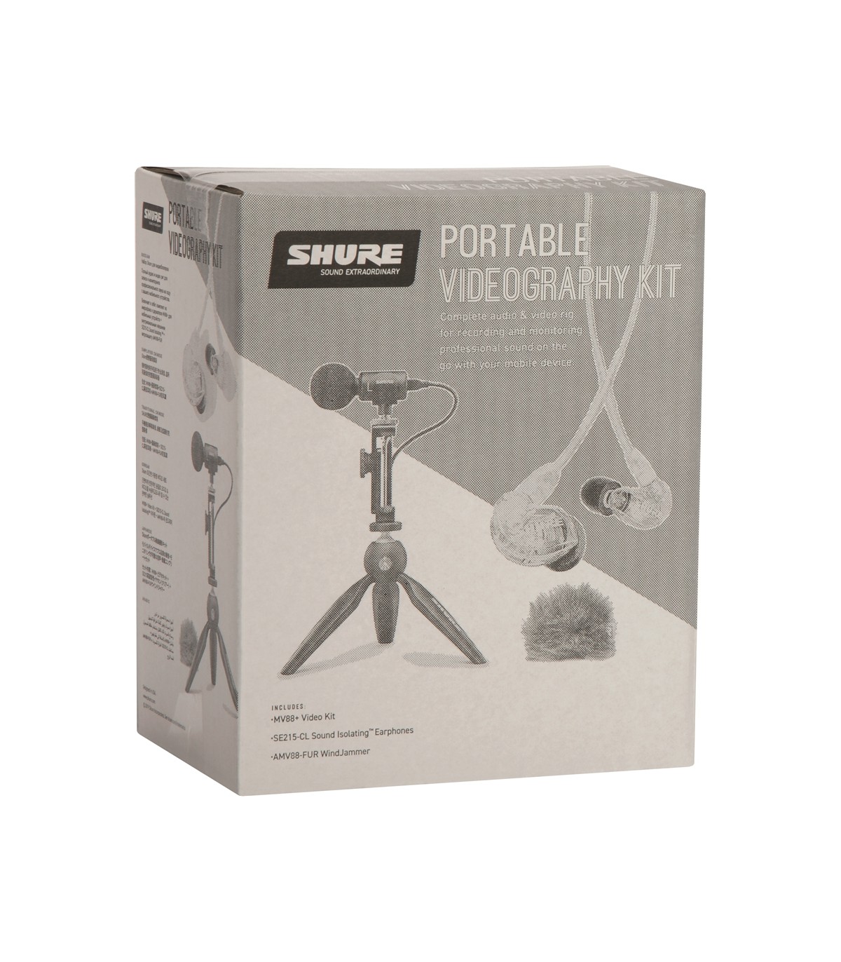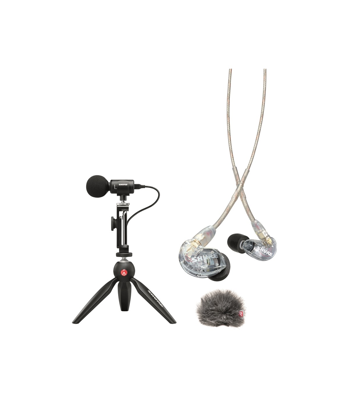 Kit che include il microfono stereo a condensatore professionale Shure MV88 nella colorazione nera e gli auricolari Shure SE215-CL