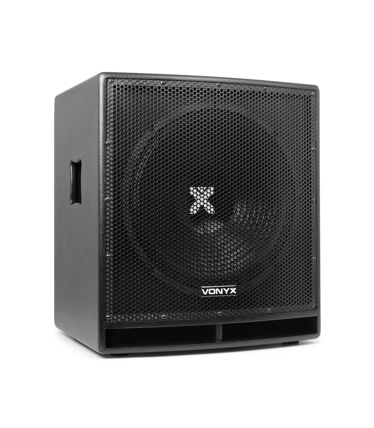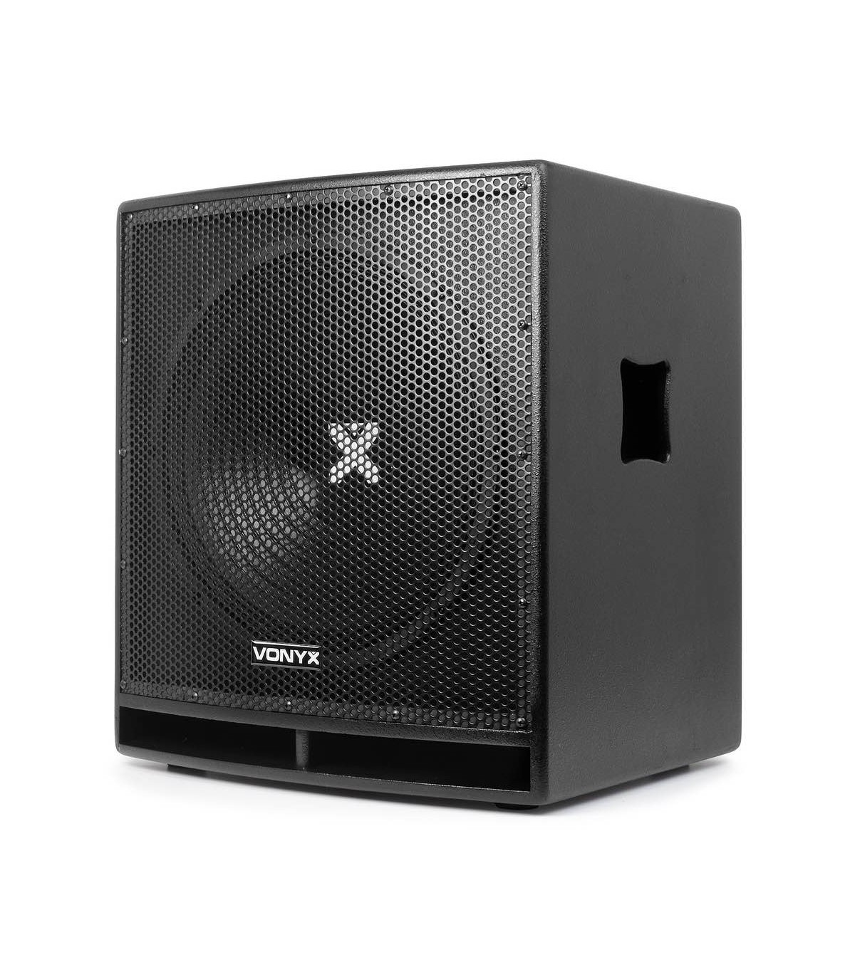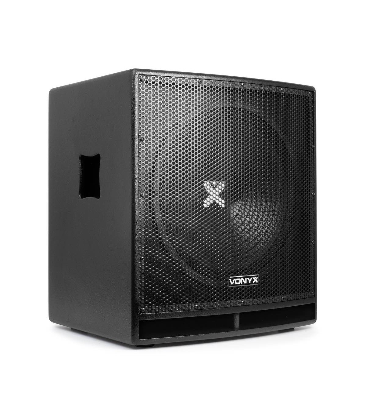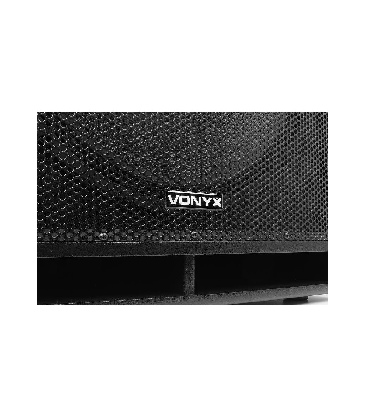 Subwoofer con filtro passa basso regolabile tra 40Hz e 250Hz. Include amplificatore da 800W, interruttore di fase per sincronizzare il subwoofer con gli altoparlanti principali e produrre bassi profondi, e connessioni IN / THRU per il collegamento con un altro subwoofer.