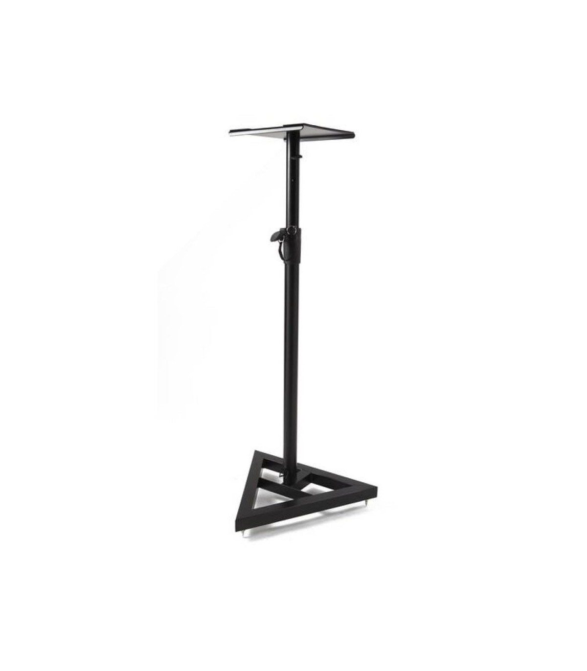 Supporto per monitor "near-field" a base triangolare. Equipaggiato con piedini conici per un isolamento ottimale dal terreno. La struttura tubolare in acciaio è provvista di un pratico sistema di regolazione dell'altezza da 850 a 1170 mm con pin di sicurezza (cinque diff erenti posizioni). Dimensioni del piatto: 230 x 230 mm. Perfetto per l'"home recording" e gli studi di registrazione. Disponibile in nero opaco.