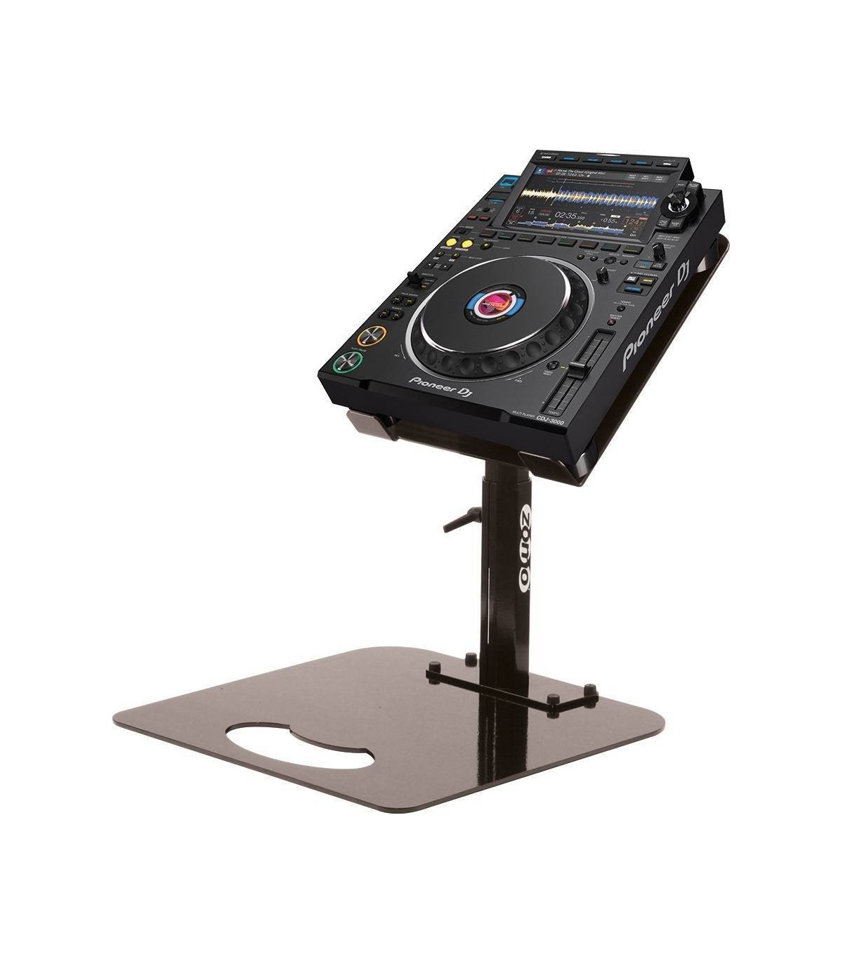 Il supporto Zomo Pro Stand P-3000 è adatto al media player professionale Pioneer CDJ-3000 e rappresenta la migliore soluzione per il posizionamento del player in mancanza di spazio direttamente sopra il mixer o i giradischi. La superficie del piano è perfettamente progettata per non far scivolare il CDJ-3000 ed è solida e stabile nel tempo. E' regolabile in altezza e ruotabile a destra-sinistra. Inoltre, il piano di appoggio è sostituibile rapidamente in caso di passaggio futuro a un nuovo media player diverso. Di comodo utilizzo anche in viaggio. Il supporto può essere installato facilmente su qualsiasi piano attraverso 4 viti di sostegno. La base (opzionale) permette di installarlo sopra altre apparecchiature senza dover praticare alcun foro sul piano di appoggio. Protegge in modo superbo il media player contro ogni movimento accidentale liberando allo stesso tempo spazio nella DJ console.