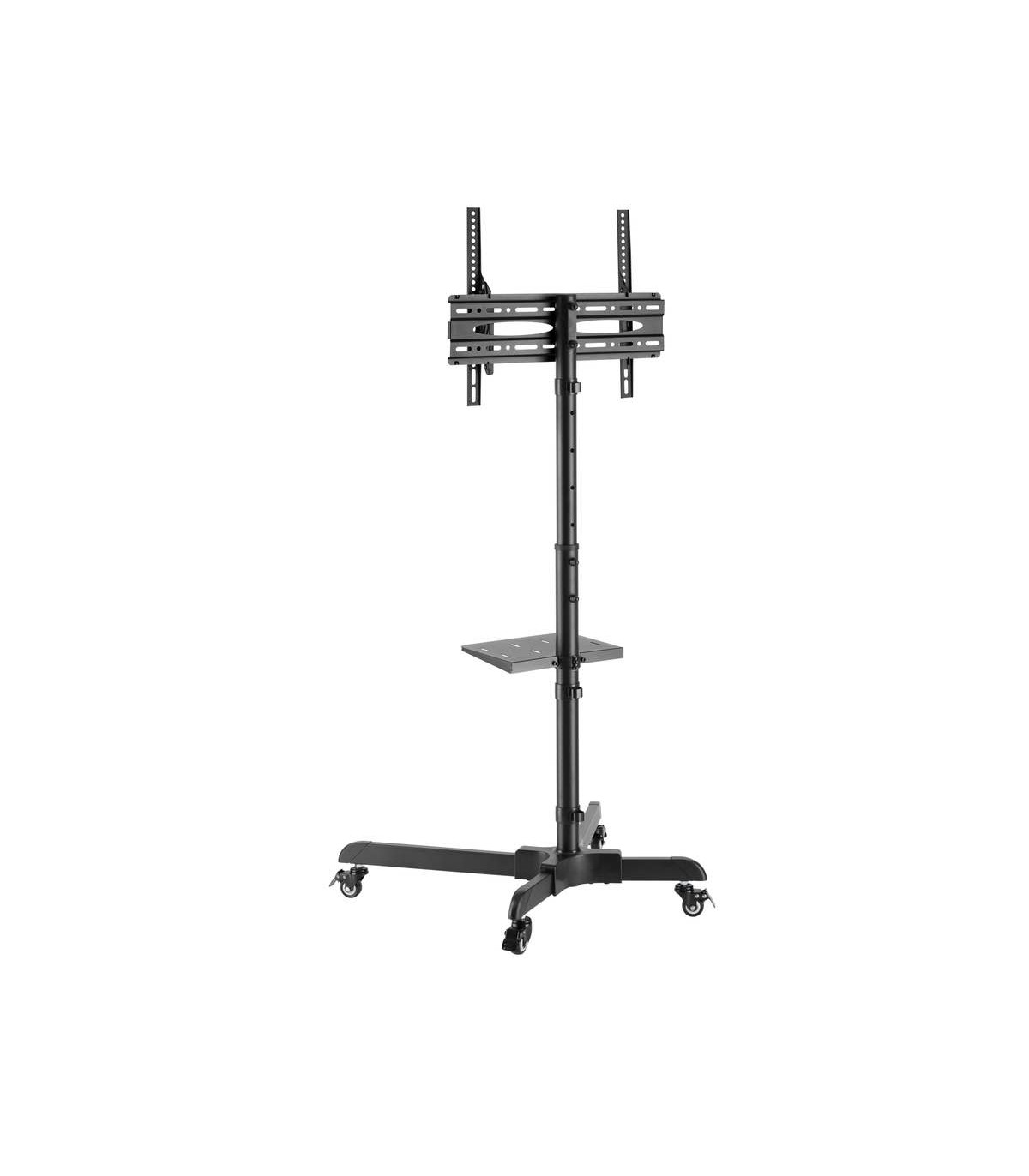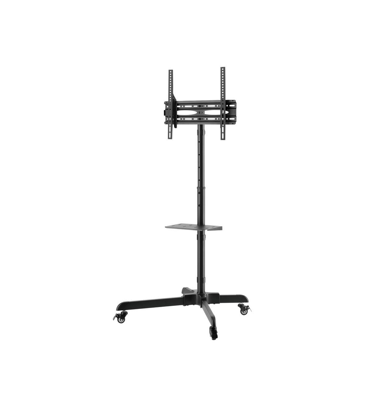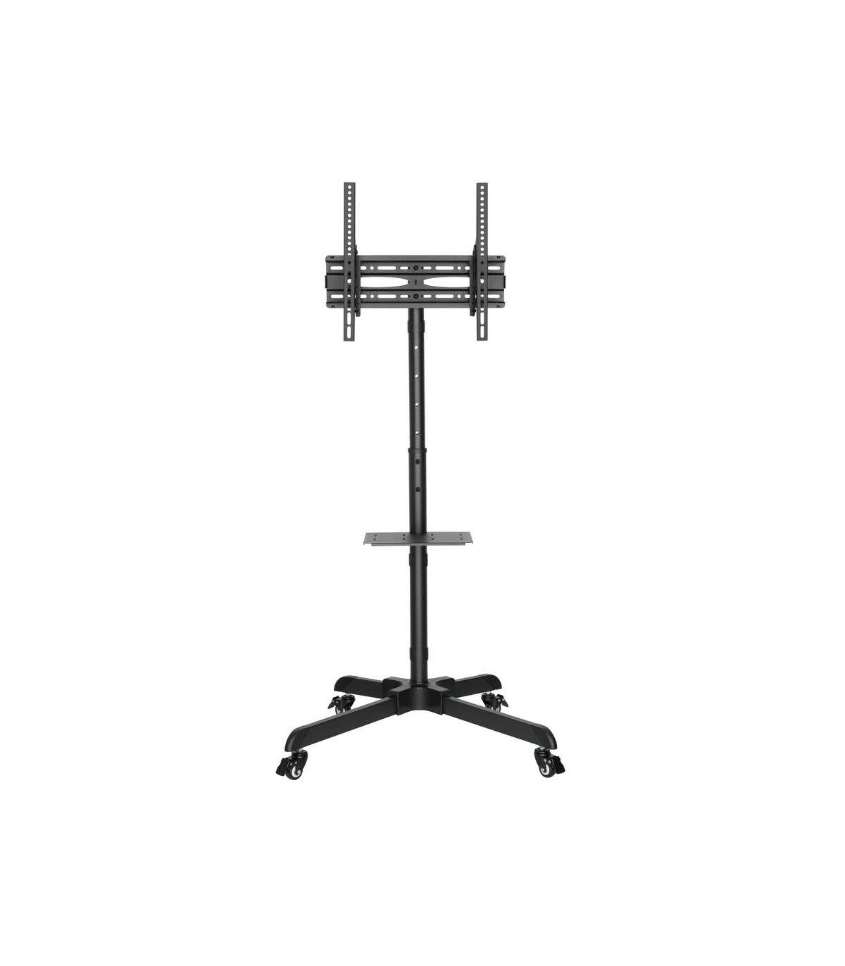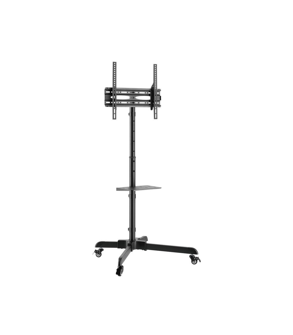 L'MFS30 è un solido carrello tv in acciaio adatto a gran parte degli schermi piatti da 32"a 65" e fino a 35 kg. Il carrello TV è dotato di 6 livelli di altezza che possono essere facilmente regolati alzando o abbassando la staffa telescopica. Per un angolo di visione ottimale il monitor può ruotare da +5; ~ -12. Sotto il televisore è previsto un ripiano aggiuntivo per apparecchiature AV o altri accessori. Le 4 ruote con sistema di blocco garantiscono stabilità e sicurezza quando il carrello è fermo ed scorrevolezza in movimento. Il Sistema passacavi integrato permette di tenere i cavi in ordine ed organizzati. Compatibile VESA 100x 100, 200x 100, 200x 200, 300x 200, 300x300, 400x 200, 400x 300 e 400x 400.