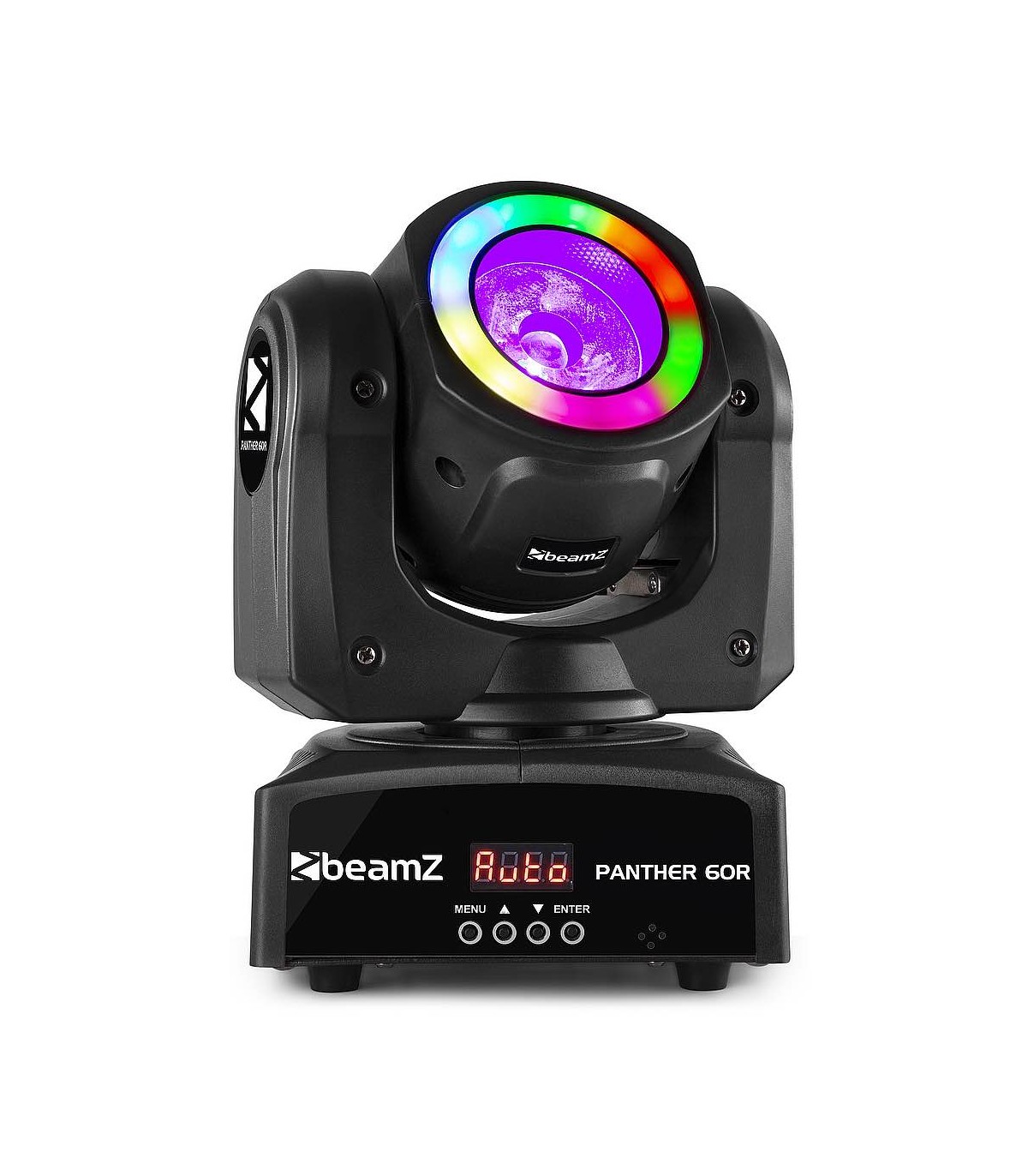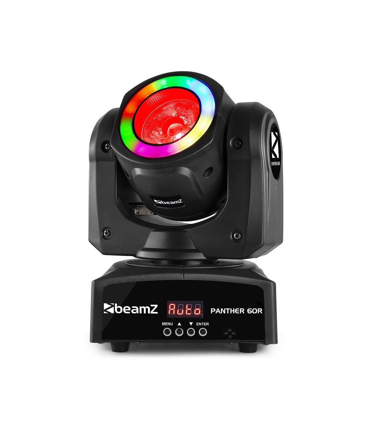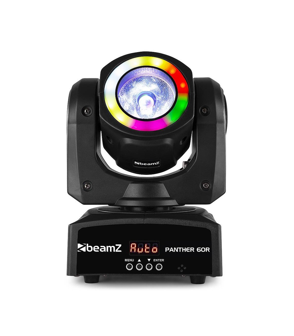 Una testa mobile molto compatta ma potente ed estremamente veloce con anello LED a effetto. Il LED Ultra-luminoso da 60W RGBW produce colori primari saturi, sottili tonalità pastello e sfumature naturali di bianco. Panter 60R è di facile funzionamento e con il suo angolo di fascio di 5 gradi ha un impatto fantastico sul tuo spettacolo di luci. L'anello LED è controllabile in 3 celle da 4 sezioni. Adatto per bar, club, DJ mobili e palcoscenico.