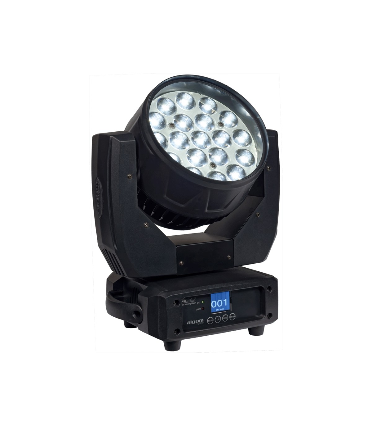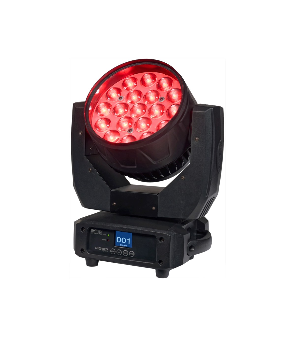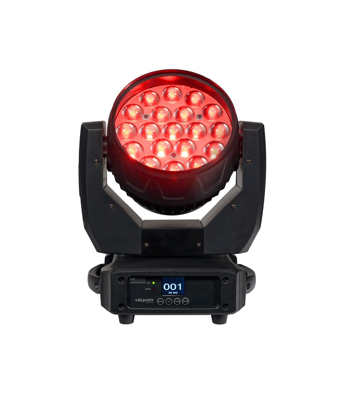 L'Algam Lighting MW19x15Z è uno WASH testa mobile con meccanismo a lira dotato di 19 LEDs RGBW da 15W ciascuno.