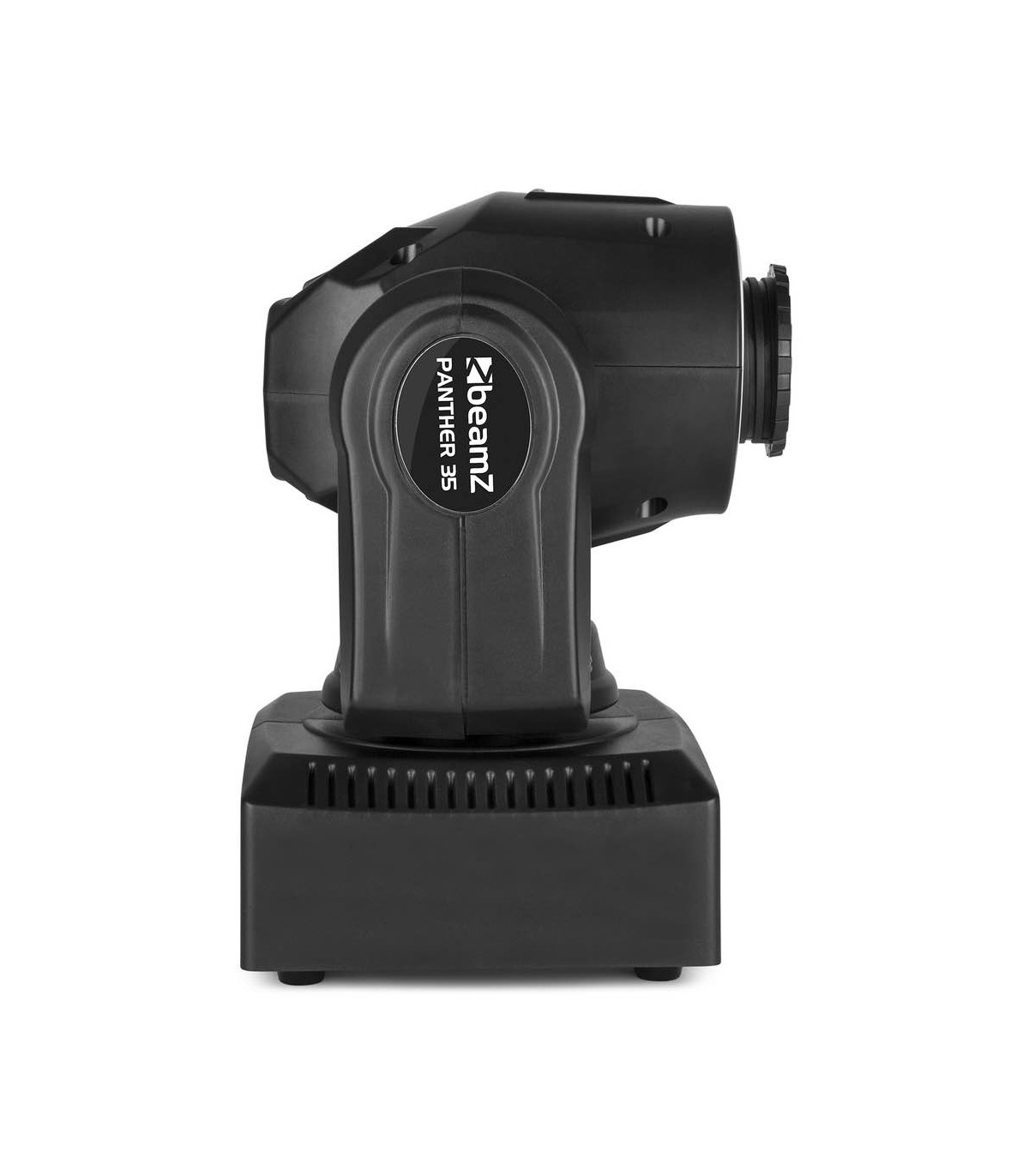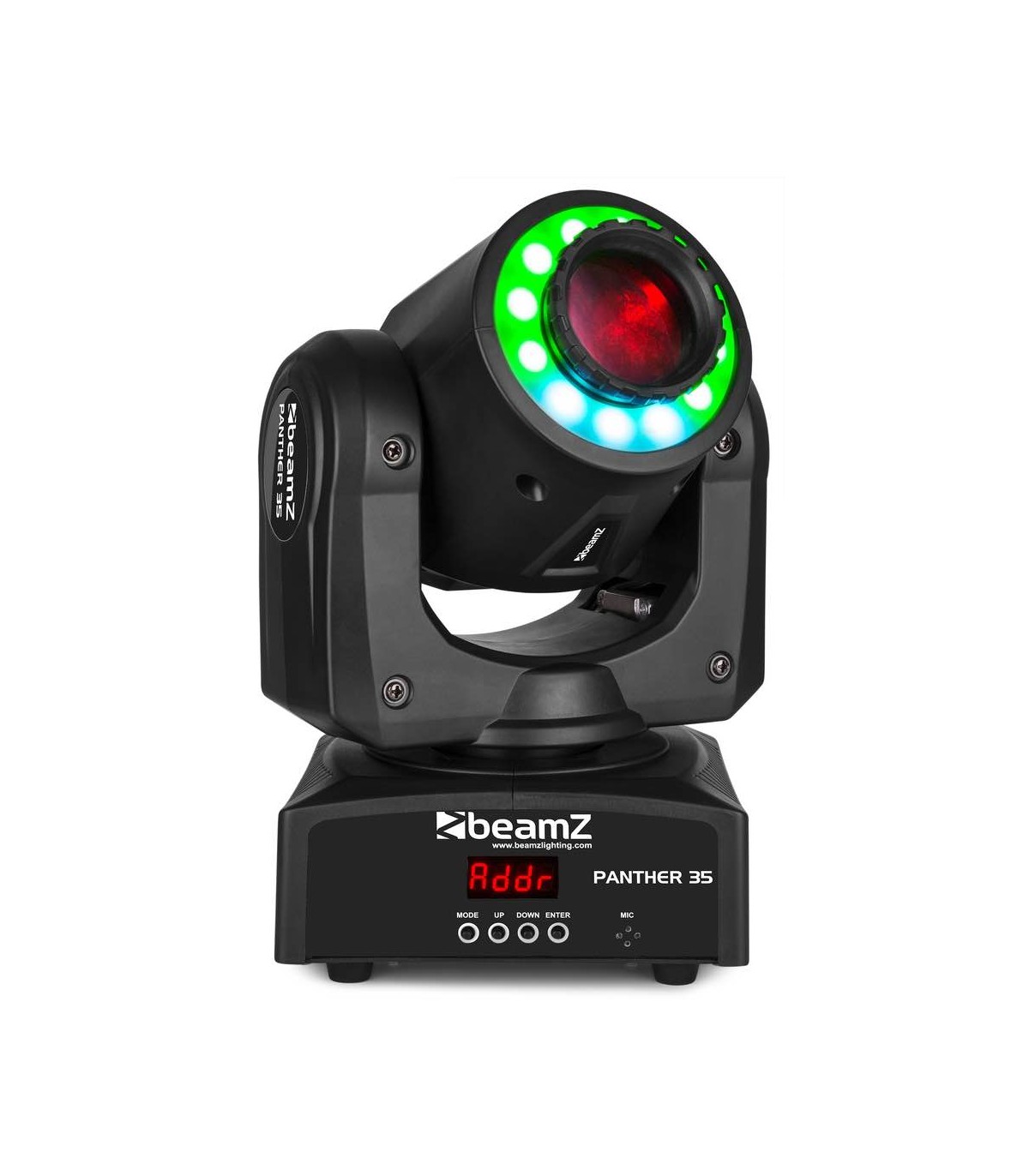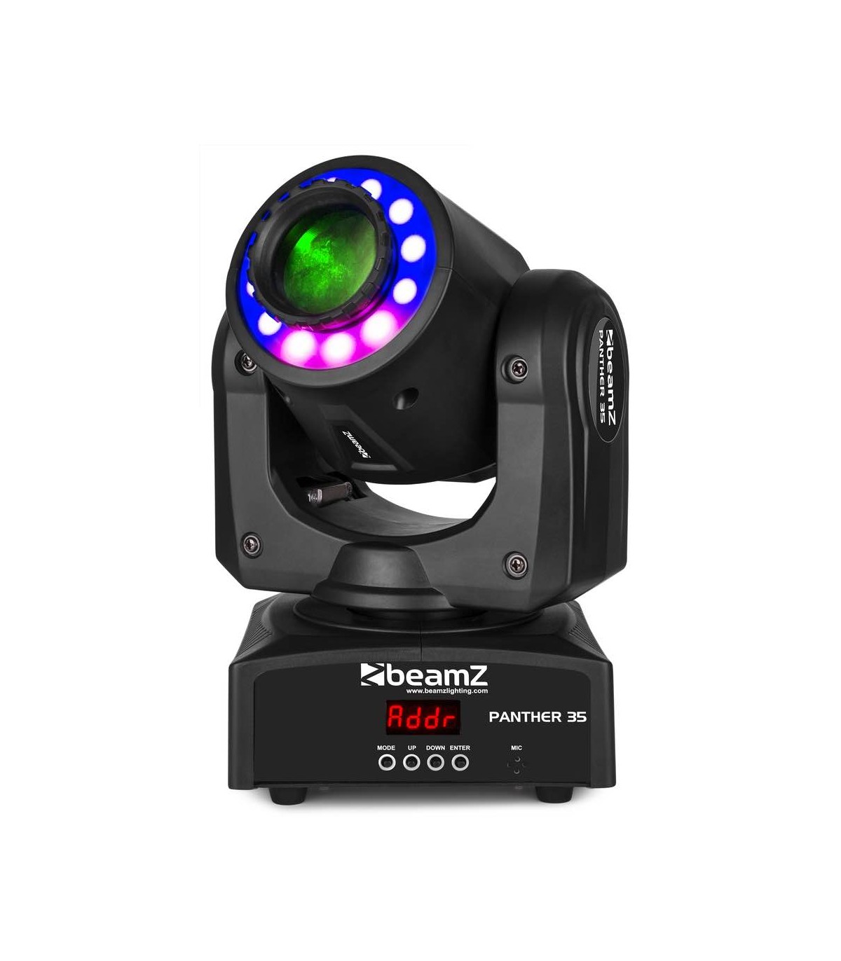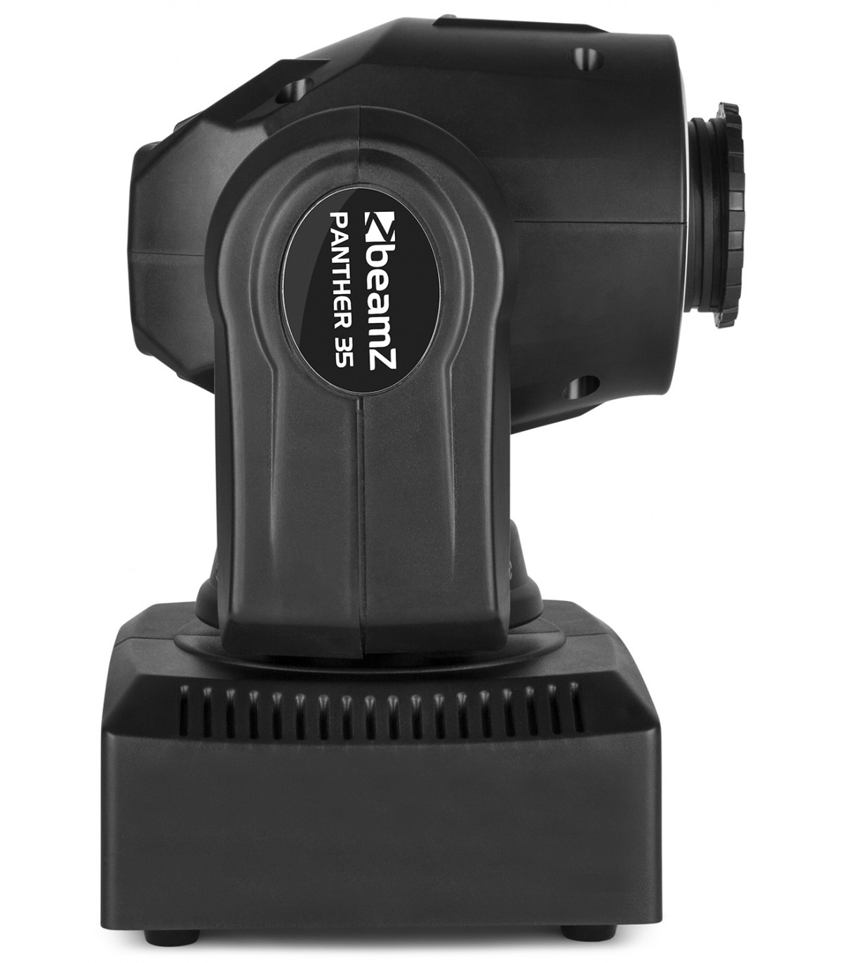 Panther 35 Spot è una potente testa mobile 2 in 1, leggera e compatta, dotata di funzioni professionali che i lighting designer, i DJ o qualsiasi animatore possono accedere tramite il controllo a bordo o un controller DMX. Caratterizzata da sette colori e sette gobo, questa testa mobile spot consente di ottenere uno spettacolo superbo sia con l'attivazione sonora, uno degli 8 programmi integrati o il controllo tramite un controller DMX. Panther 35 offre 9 o 11 canali di controllo DMX, una messa a fuoco manuale, un menu DMX a 4 pulsanti, un dimming elettronico (0-100%) e un effetto di oscillazione gobo. L'anello a 4 sezioni controllabile produce un'esperienza visiva ipnotizzante dei cambiamenti di colore.