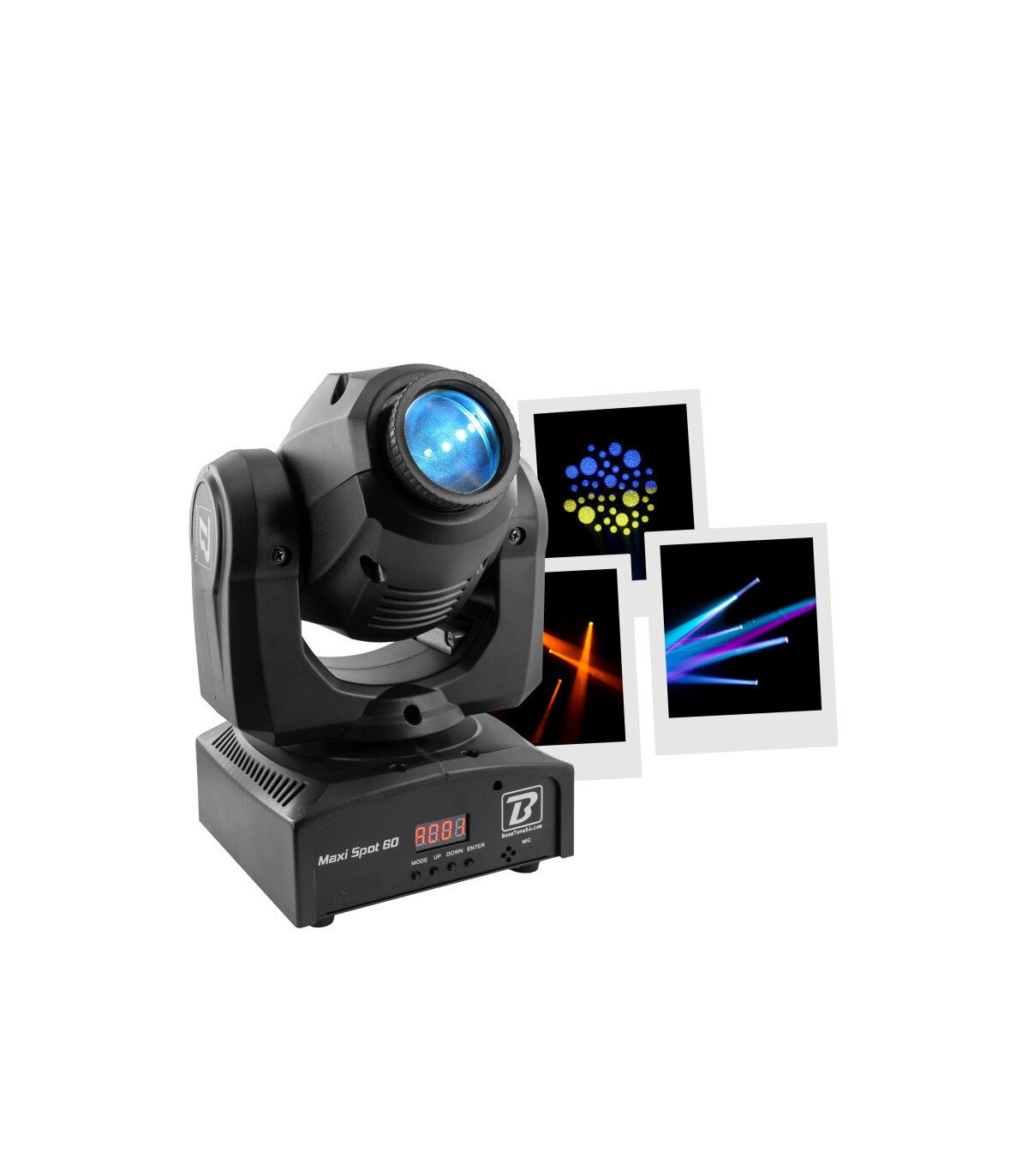 Testa mobile a LED da 60 W spot ad altissima luminosità , ideale per i DJ grazie alla sua custodia compatta e ai suoi numerosi programmi automatizzati. E' dotato di una ruota a 7 colori e una ruota di 7 Gobo. Effetto Shake, Strobo a velocità variabile e un dimmer da 0 a 100% molto lineare. DMX a 8 / 10 canali. Funziona anche con la modalità musica.